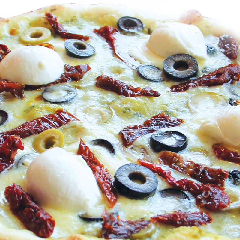 Saludable pizza con base de pesto, queso mozzarella de búfala, tomates secos, aceitunas negras y aceitunas verdes.