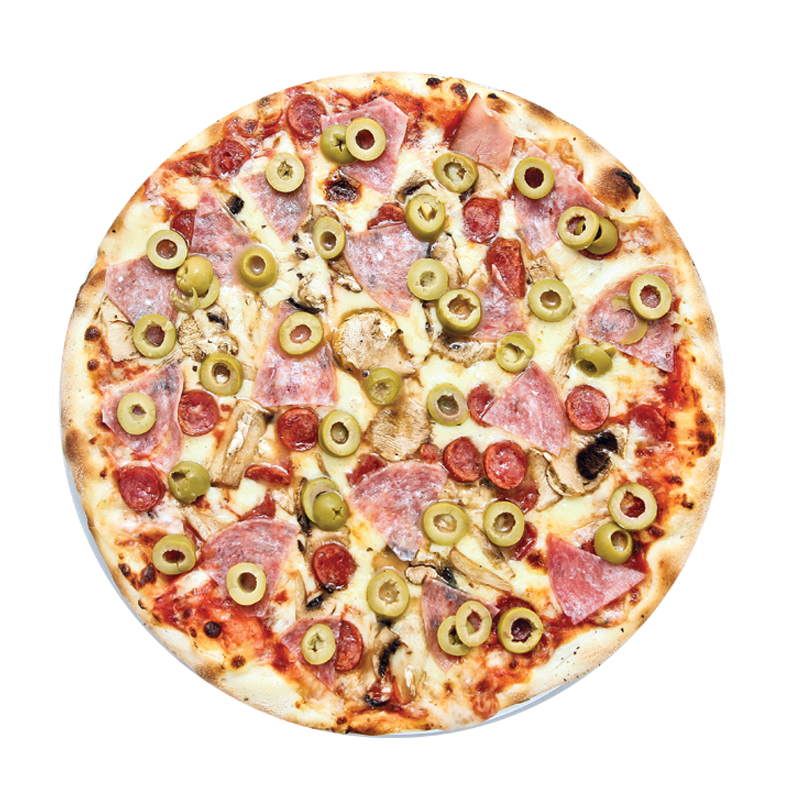 Queso, jamón, pepperoni, cabano, pollo y salame.