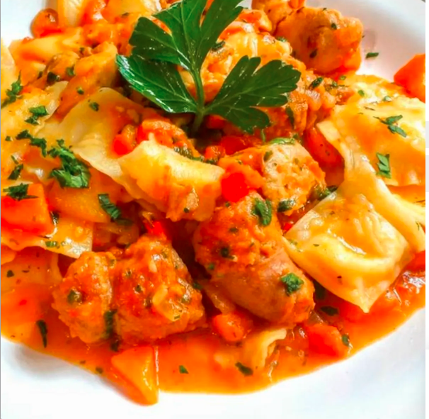 Raviolis de carne, horneados con la salsa que escojas blanca, napolitana o boloñesa.