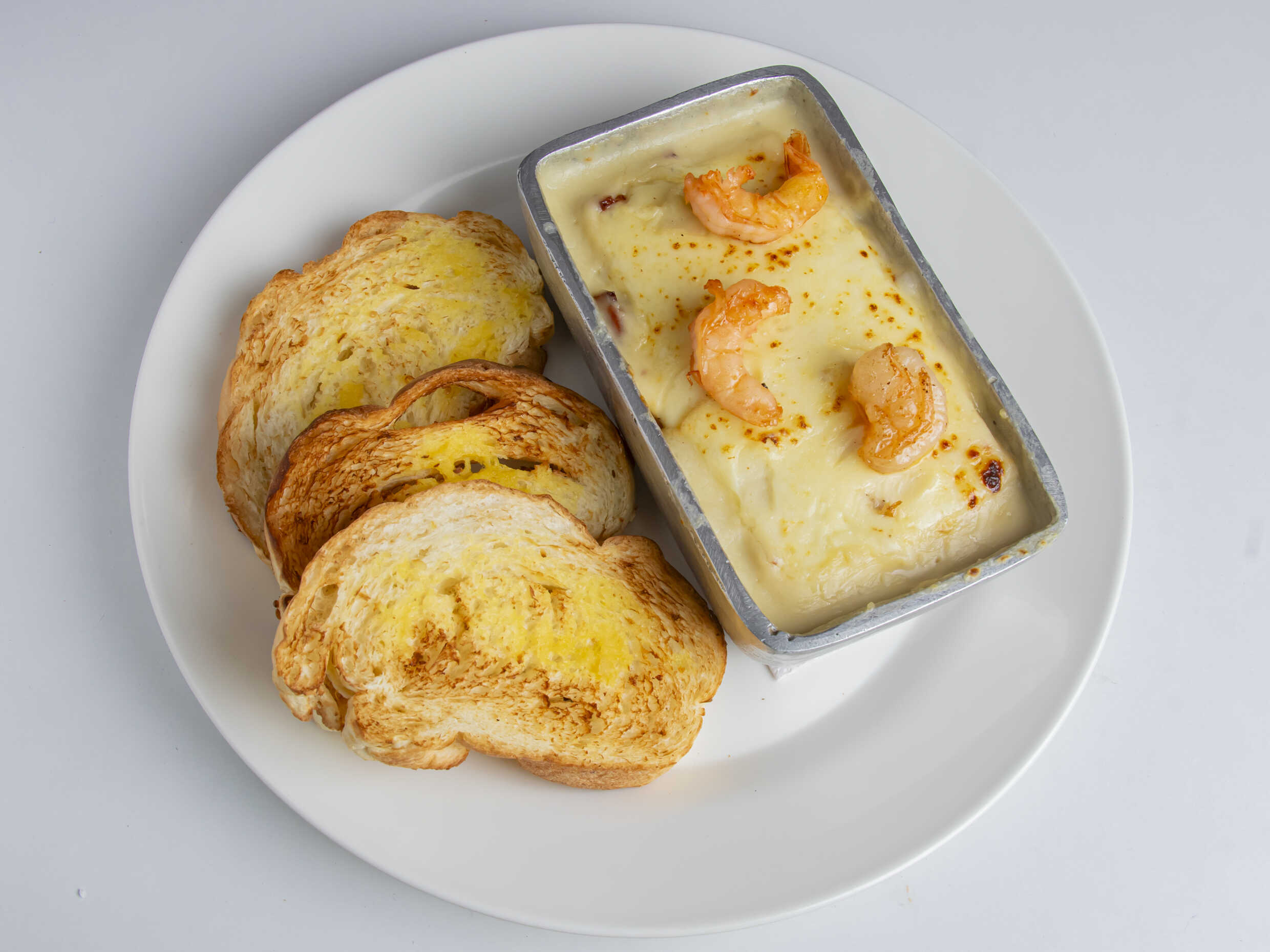 Salsa bechamel, cebolla roja, camarones al ajillo y queso parmesano.