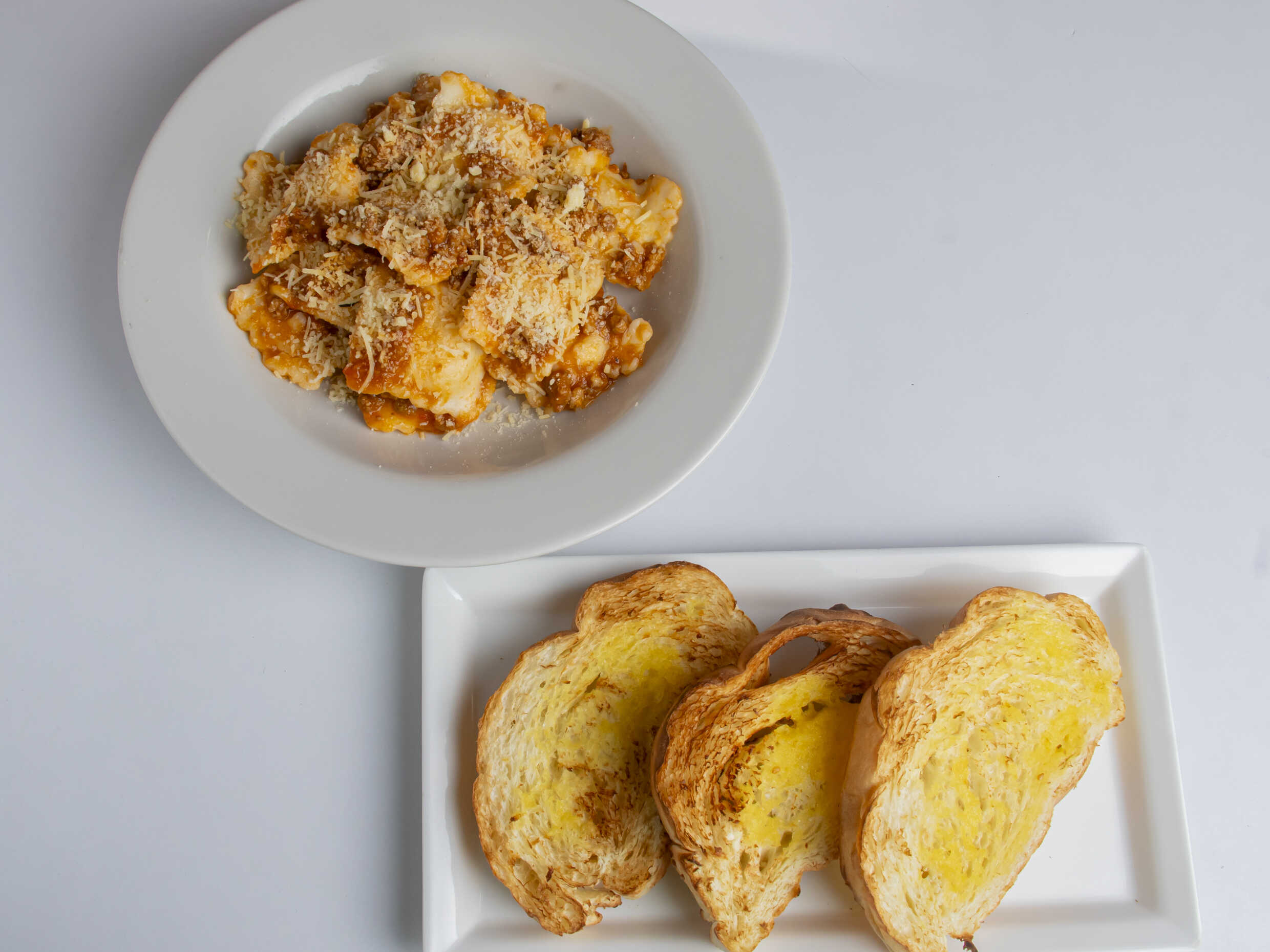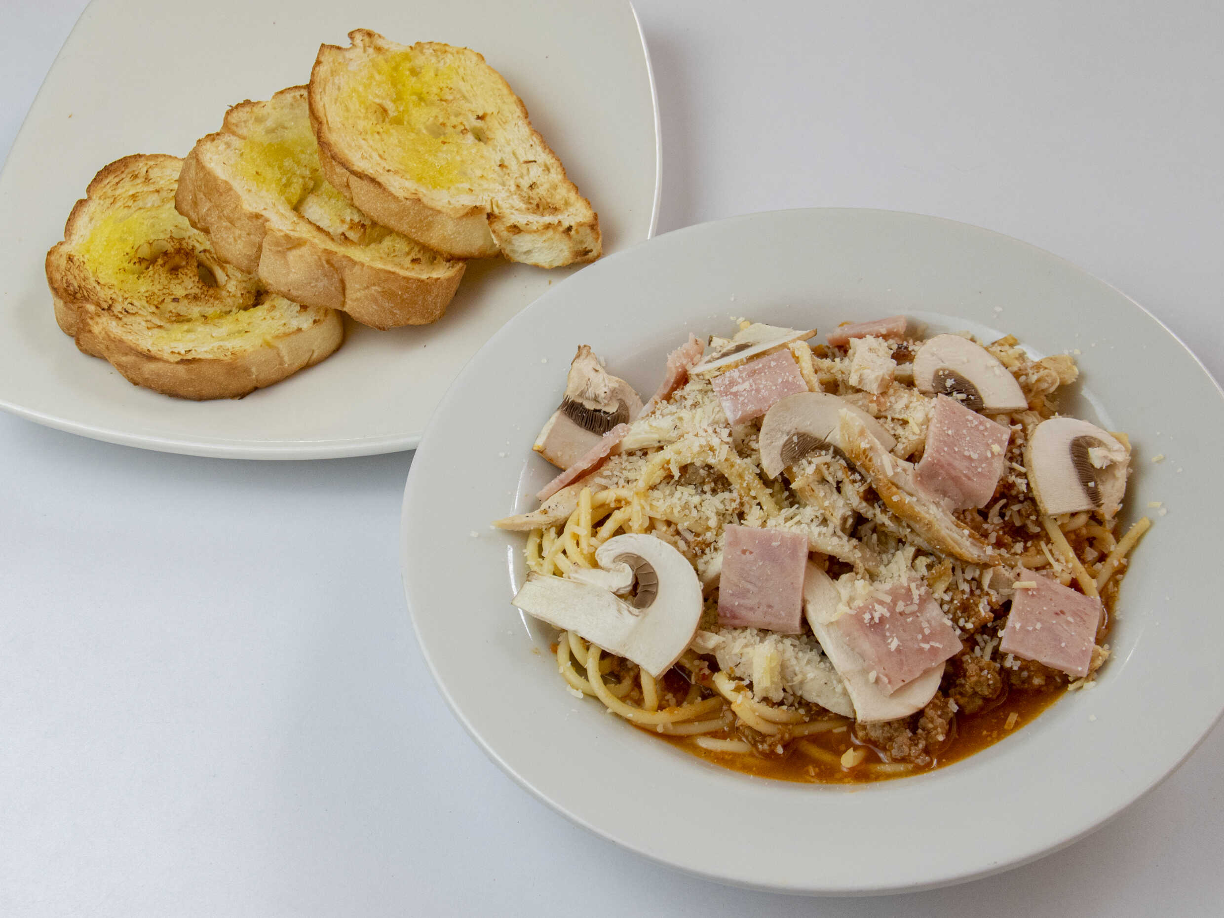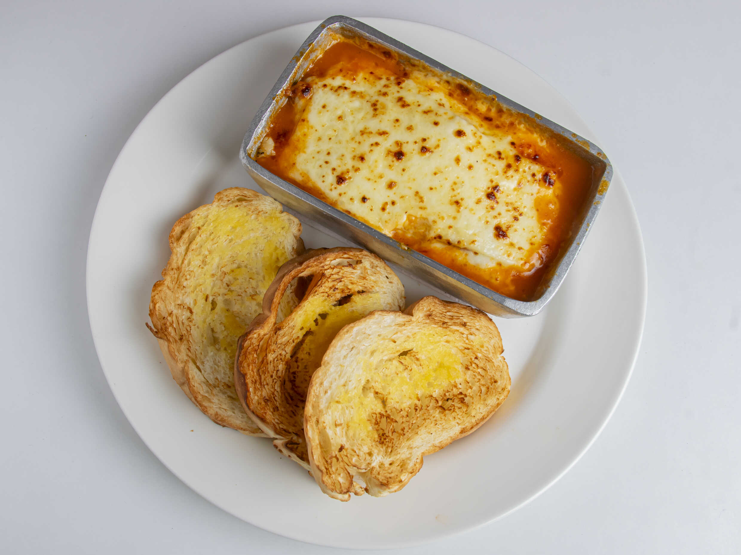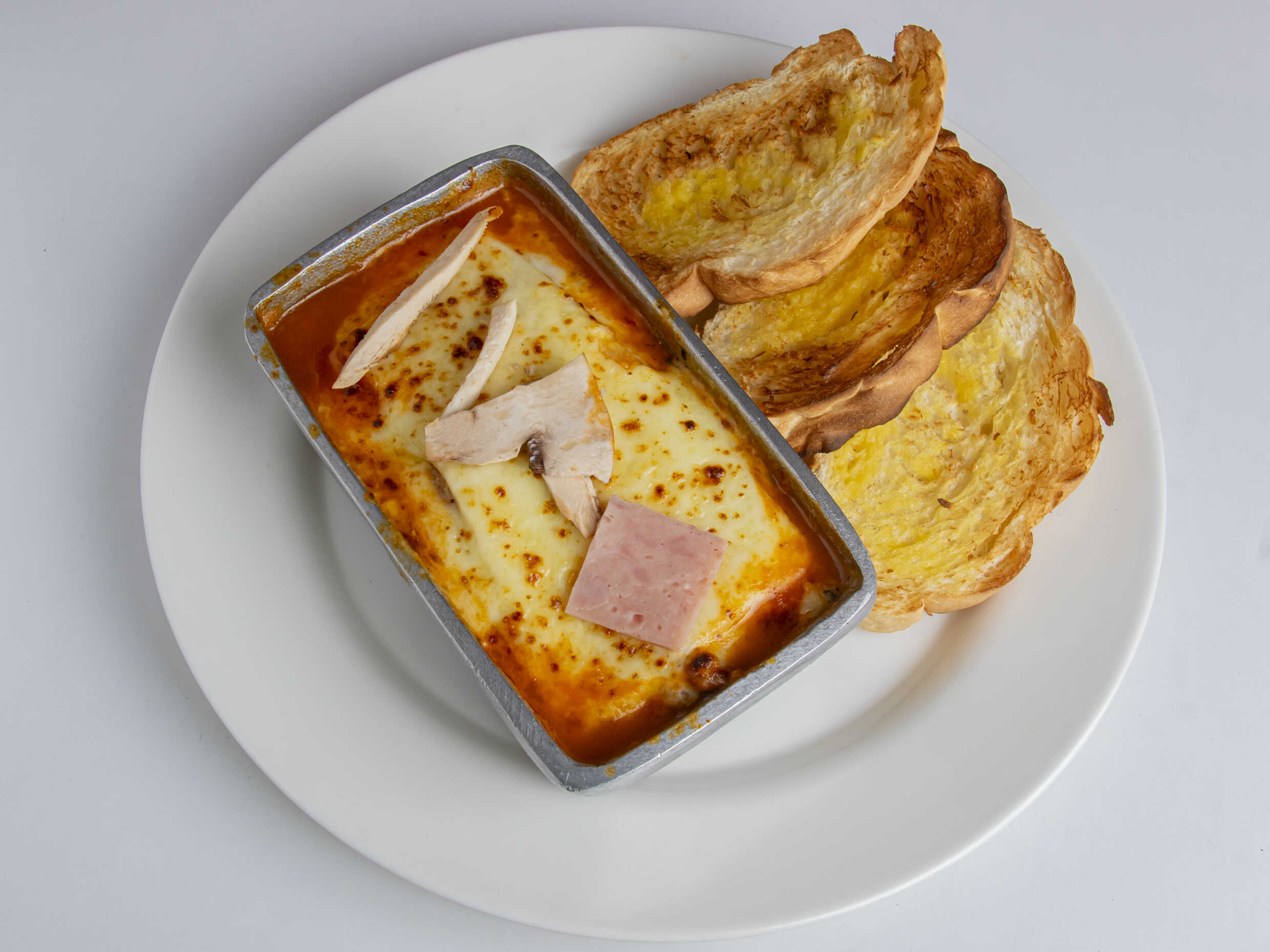 Lasagna con queso, salsa a elección, champiñones y jamón.