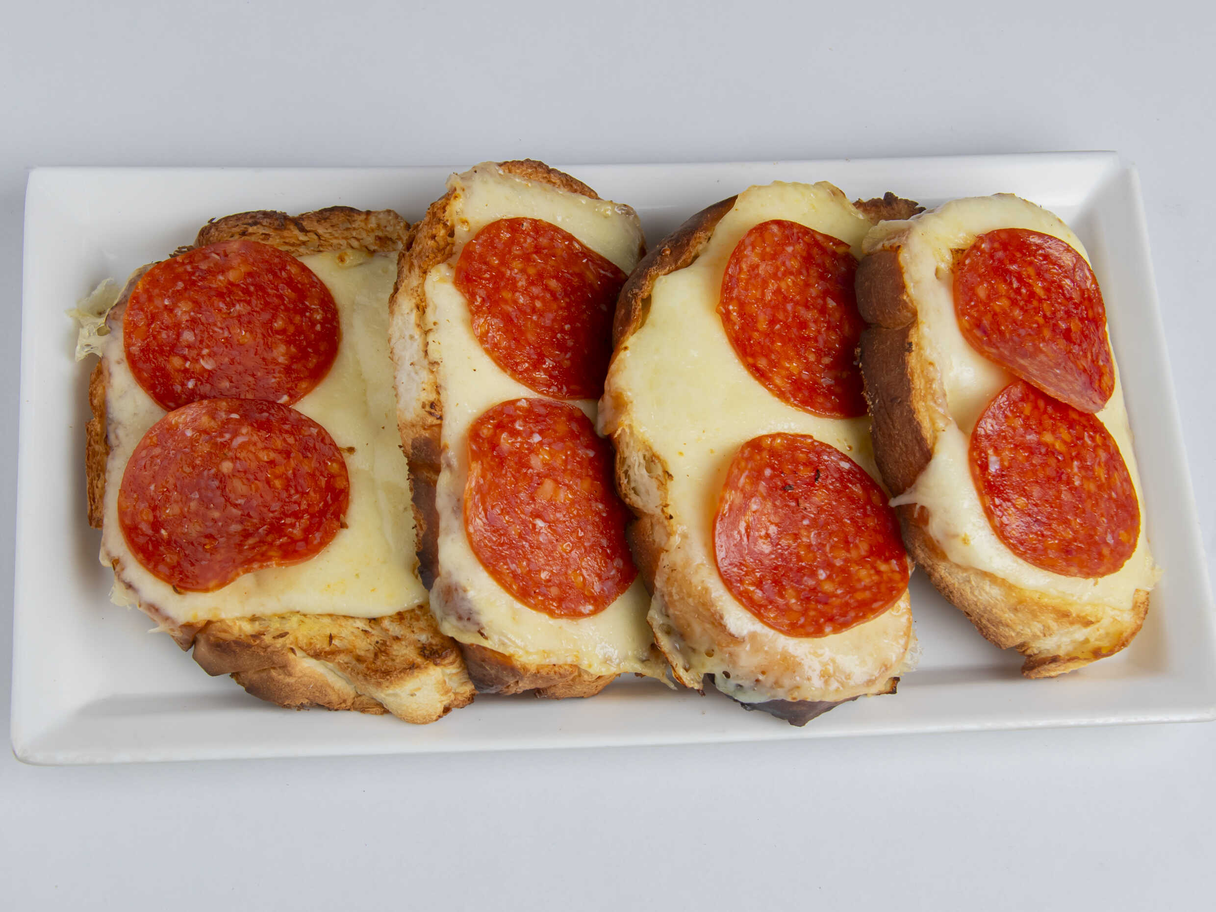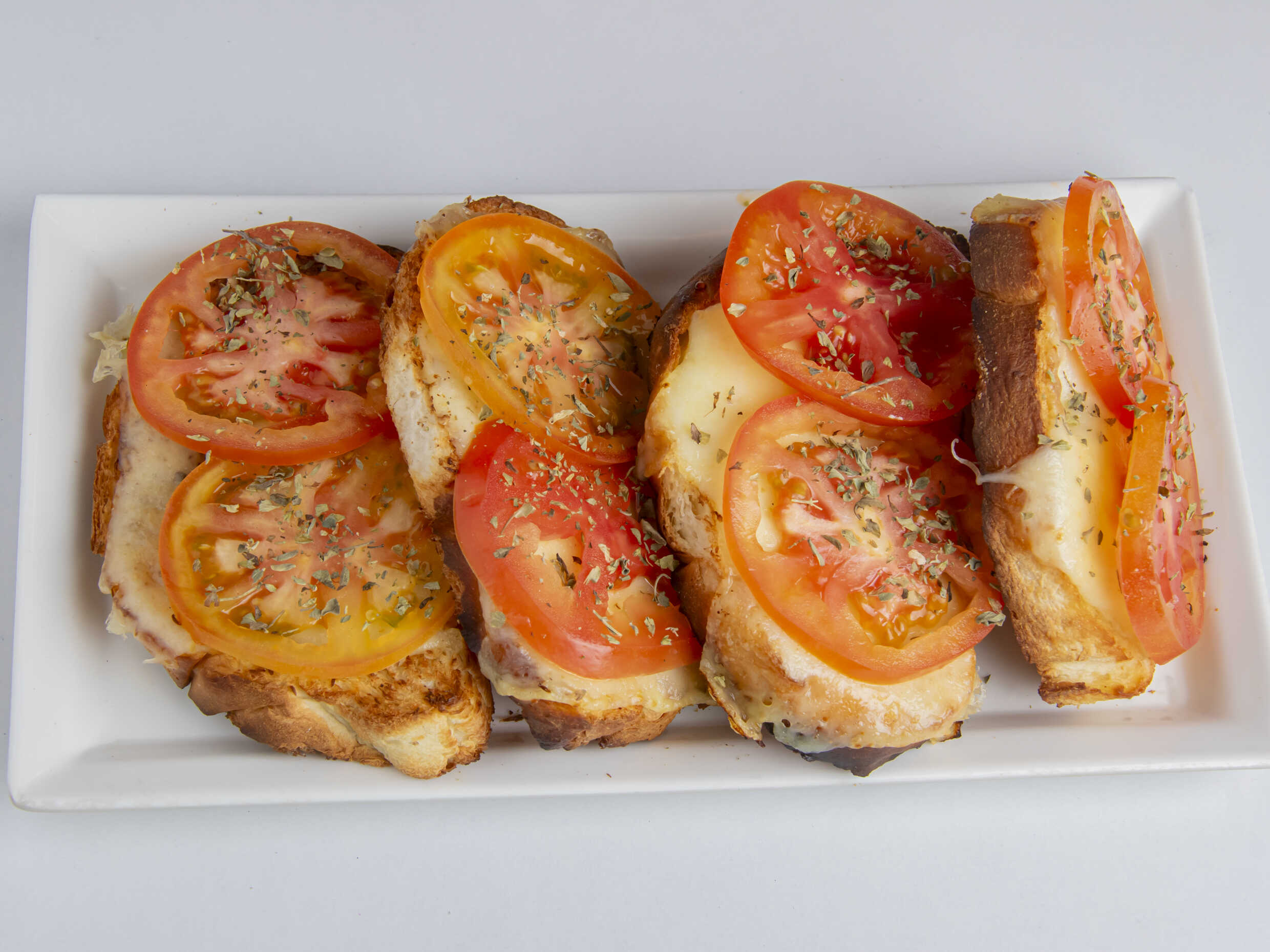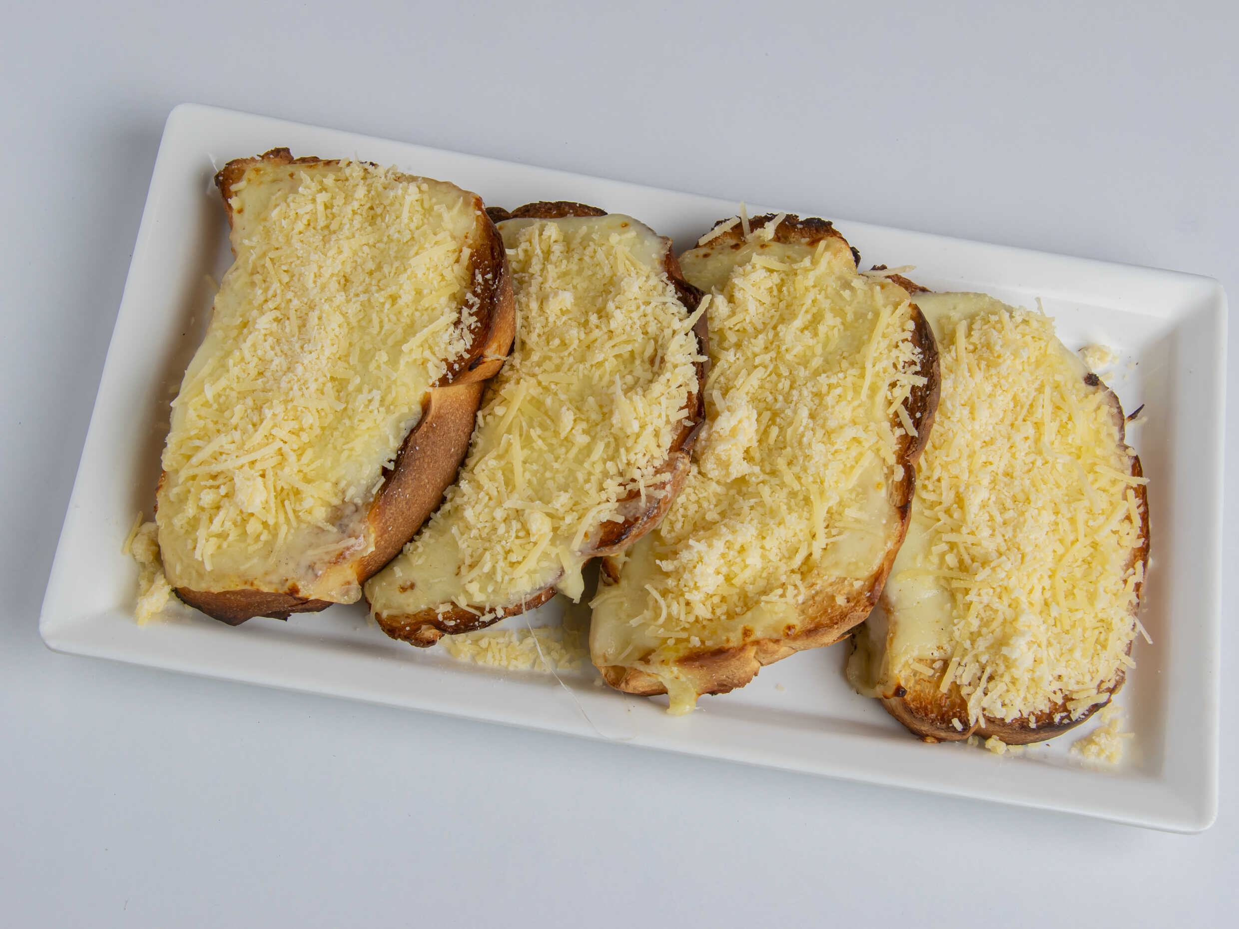 4 Tajadas de pan con queso doble crema y queso parmesano.