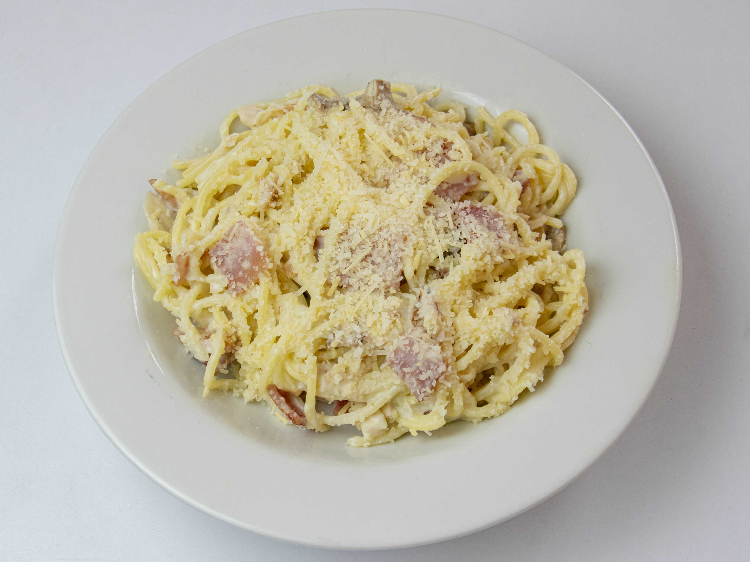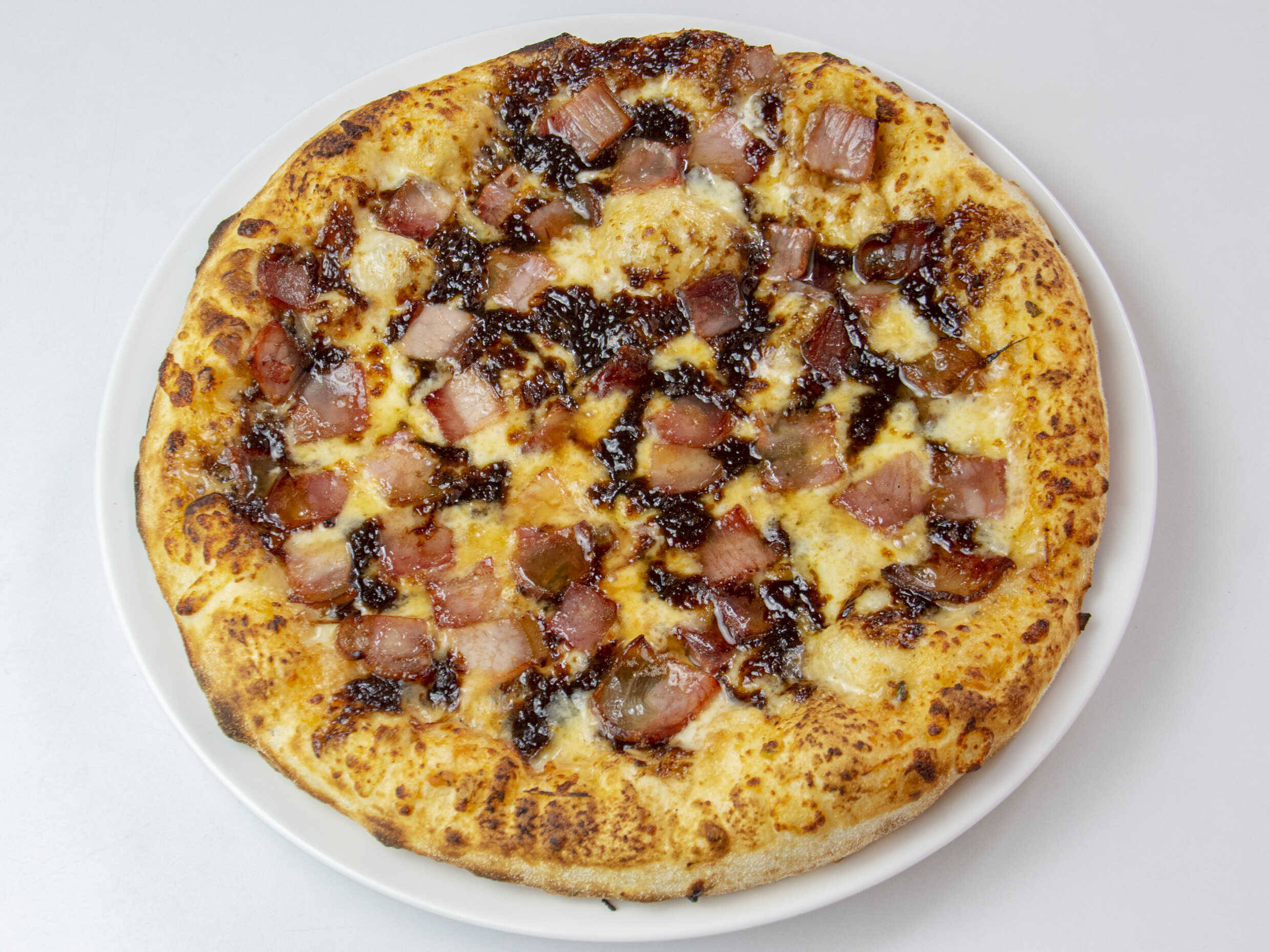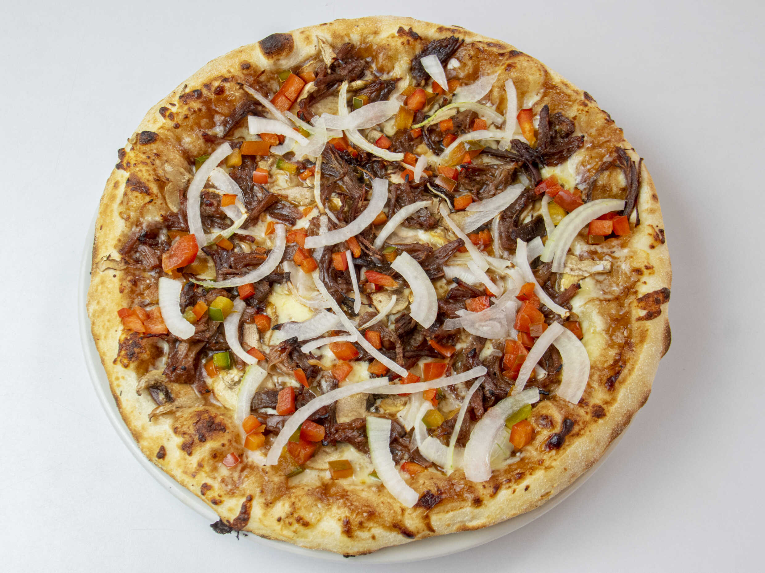 Queso, crema de leche, champiñones, pollo, tocineta y salsa BBQ.
