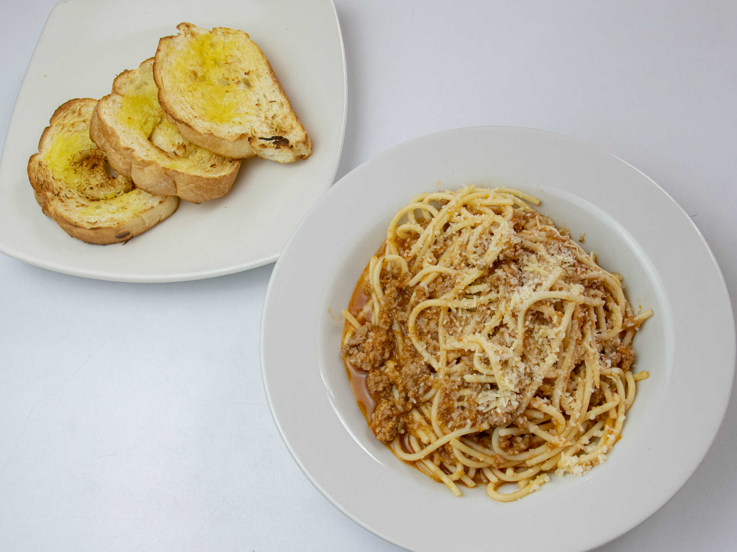 Queso, salsa napolitana, salsa boloñesa y jamón.
