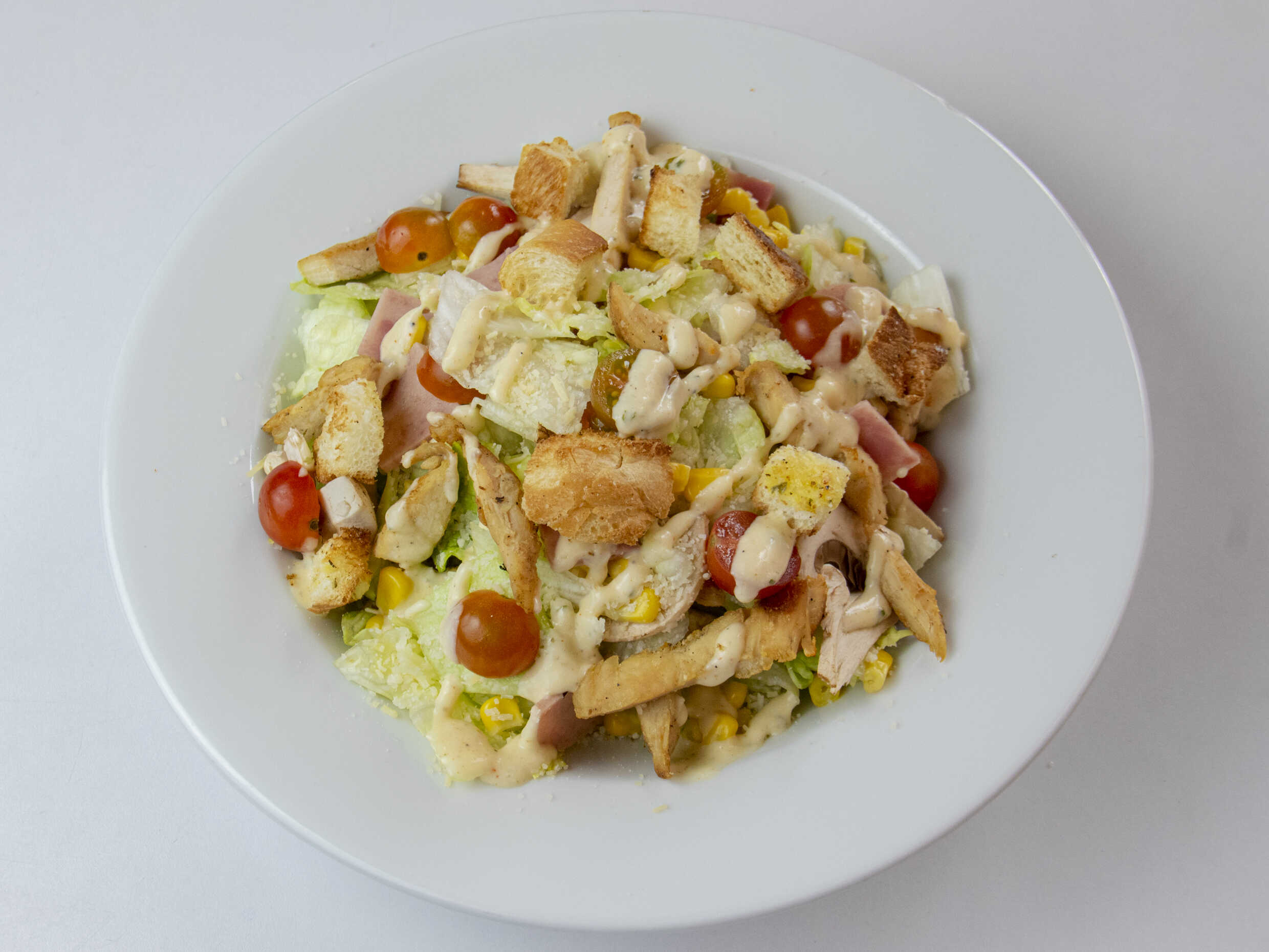 Lechuga, champiñones, maíz, tomate en cubitos, croutones de pan, queso parmesano, pollo desmenuzado y salsa ranch.