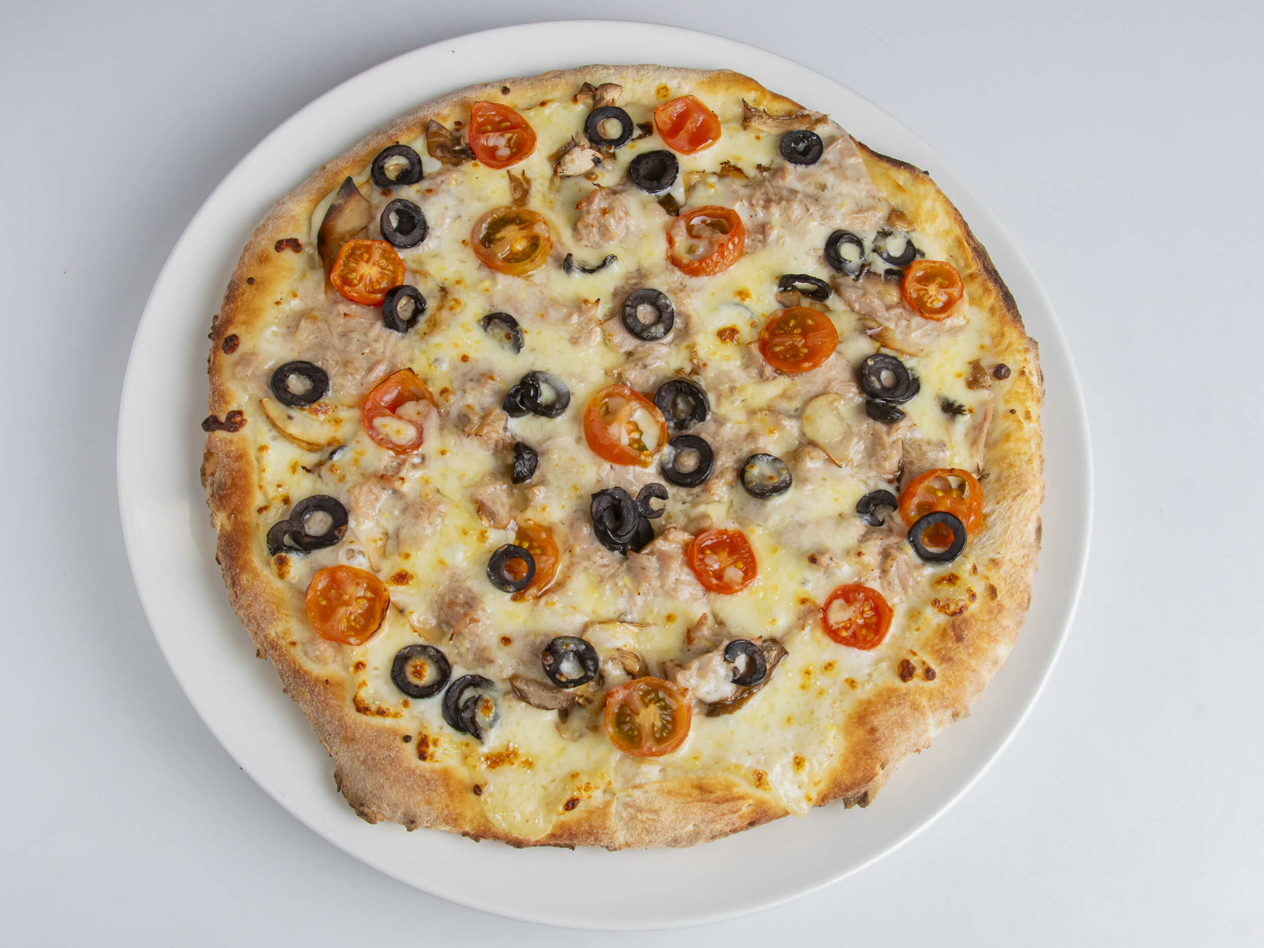 Queso, salsa napolitana, champiñones, cebolla roja, tomate cherry, aceitunas y Atún.