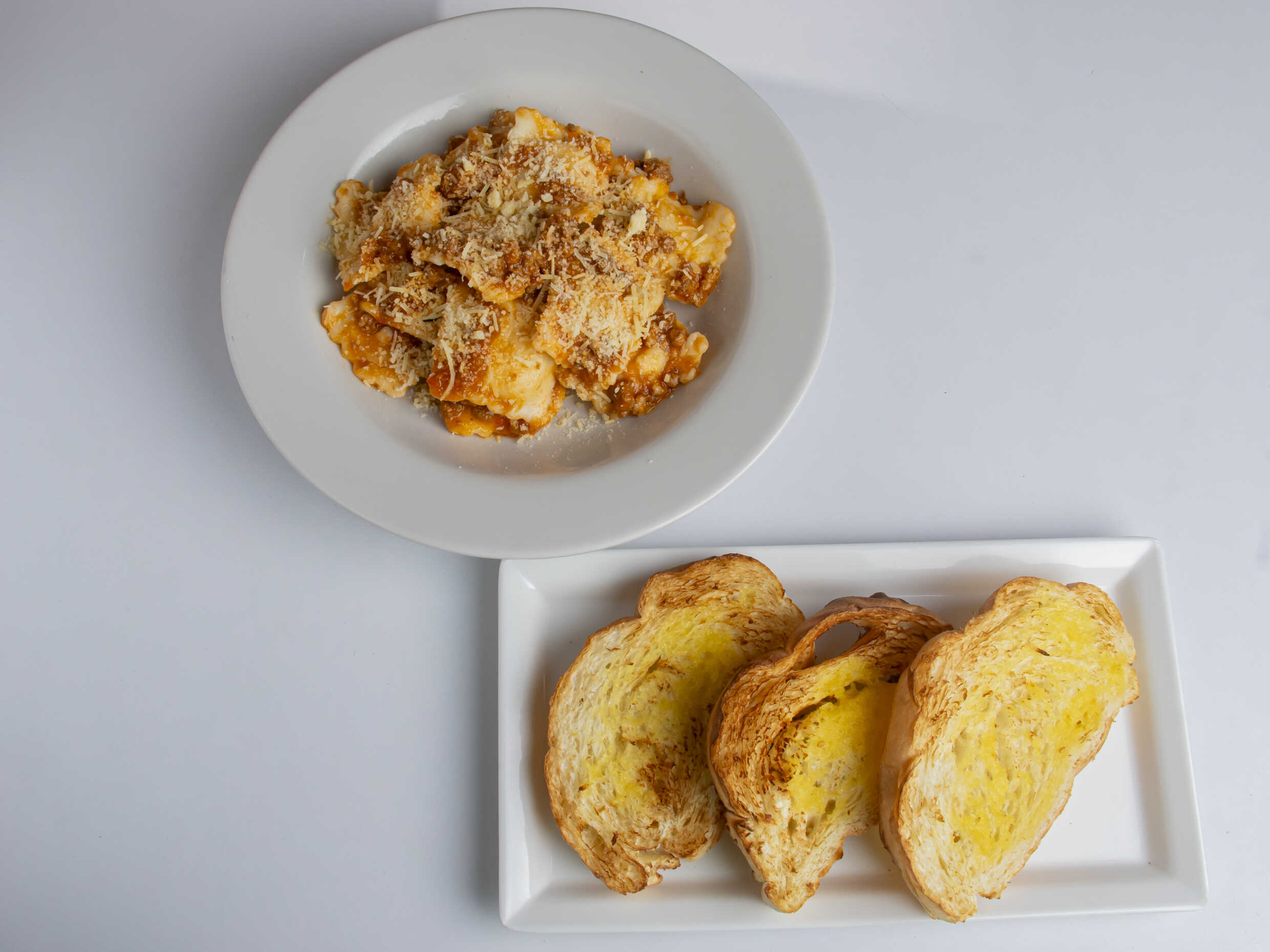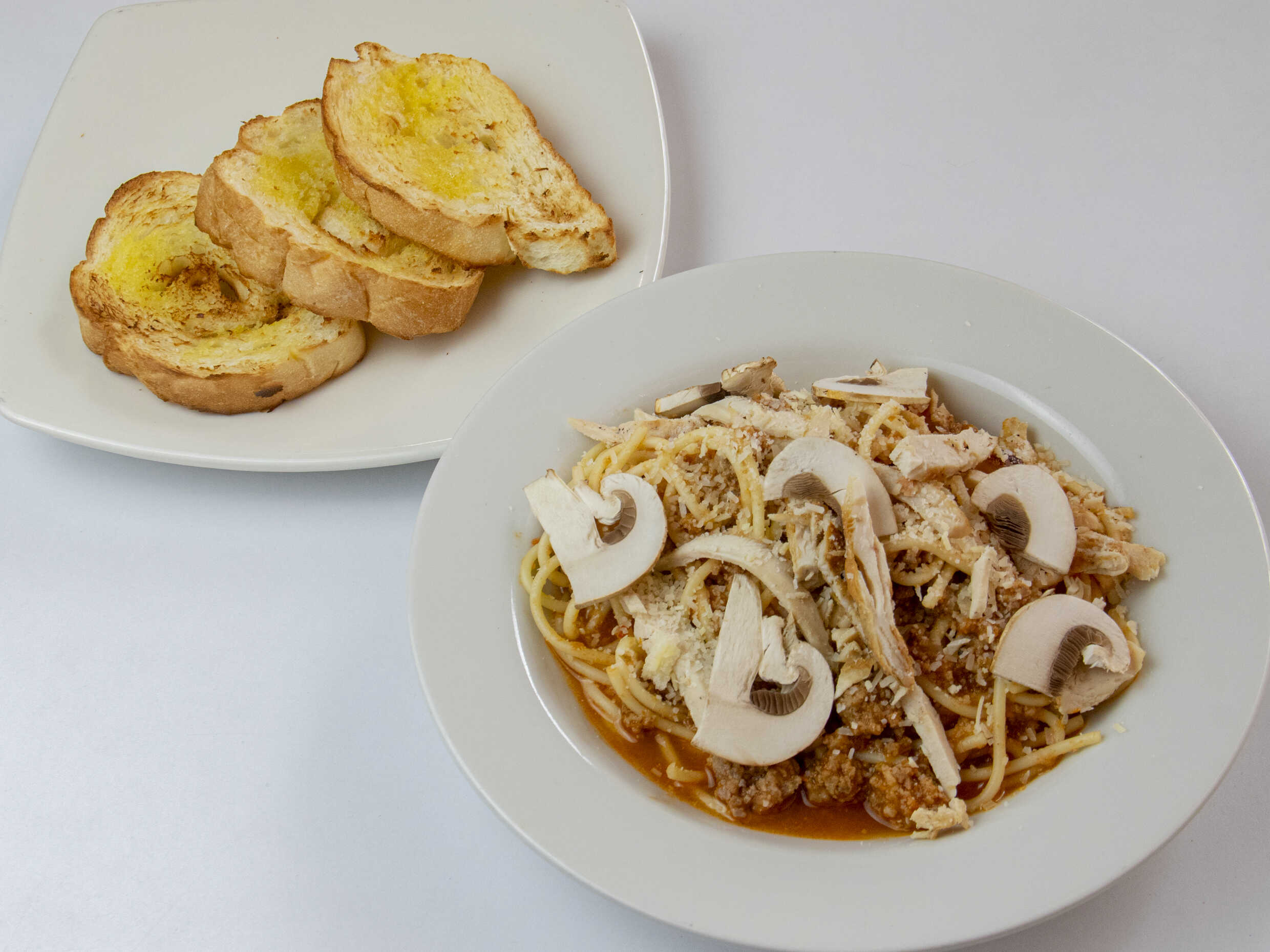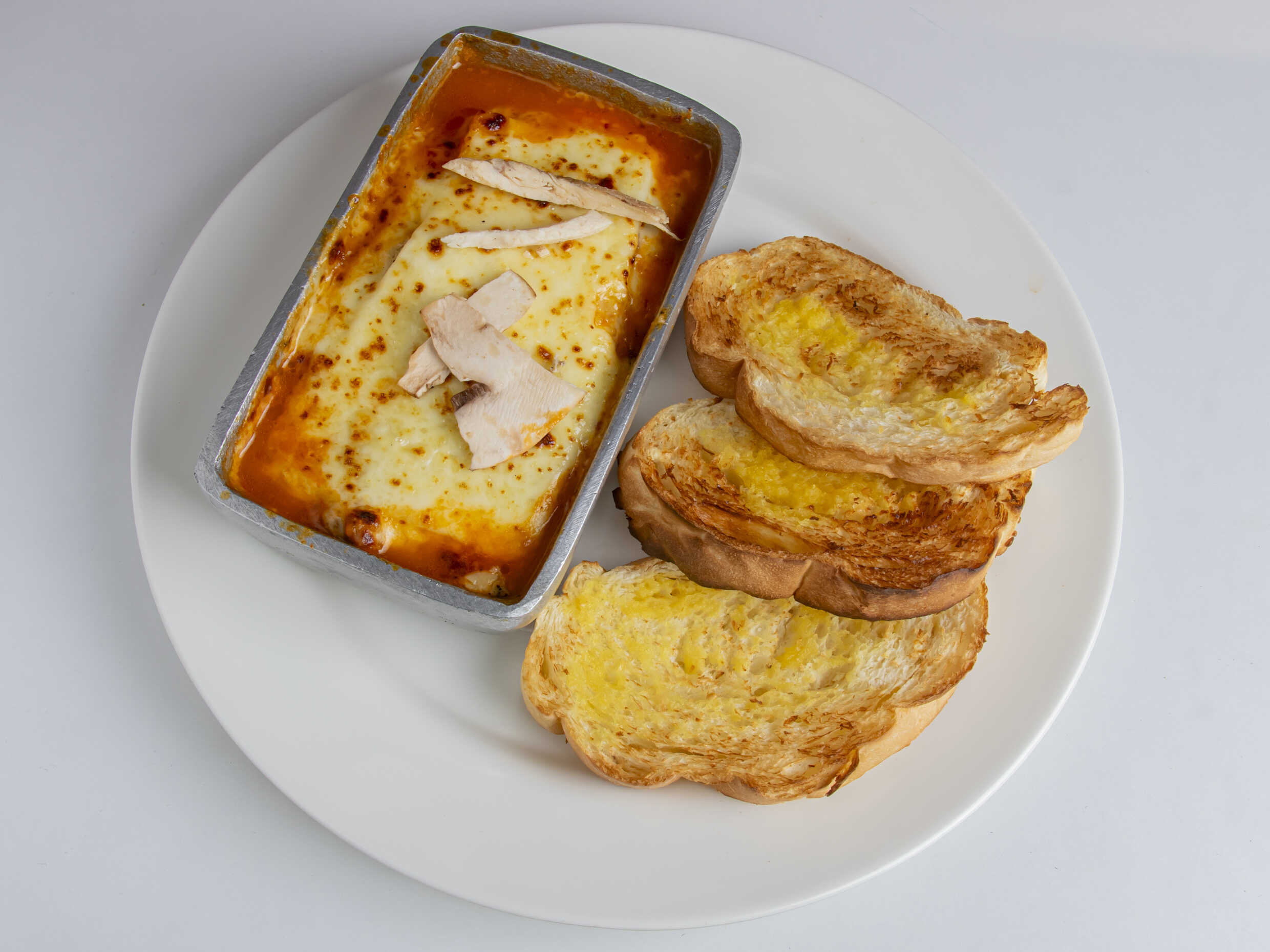 Lasagna con queso, salsa a elección, champiñones y pollo.