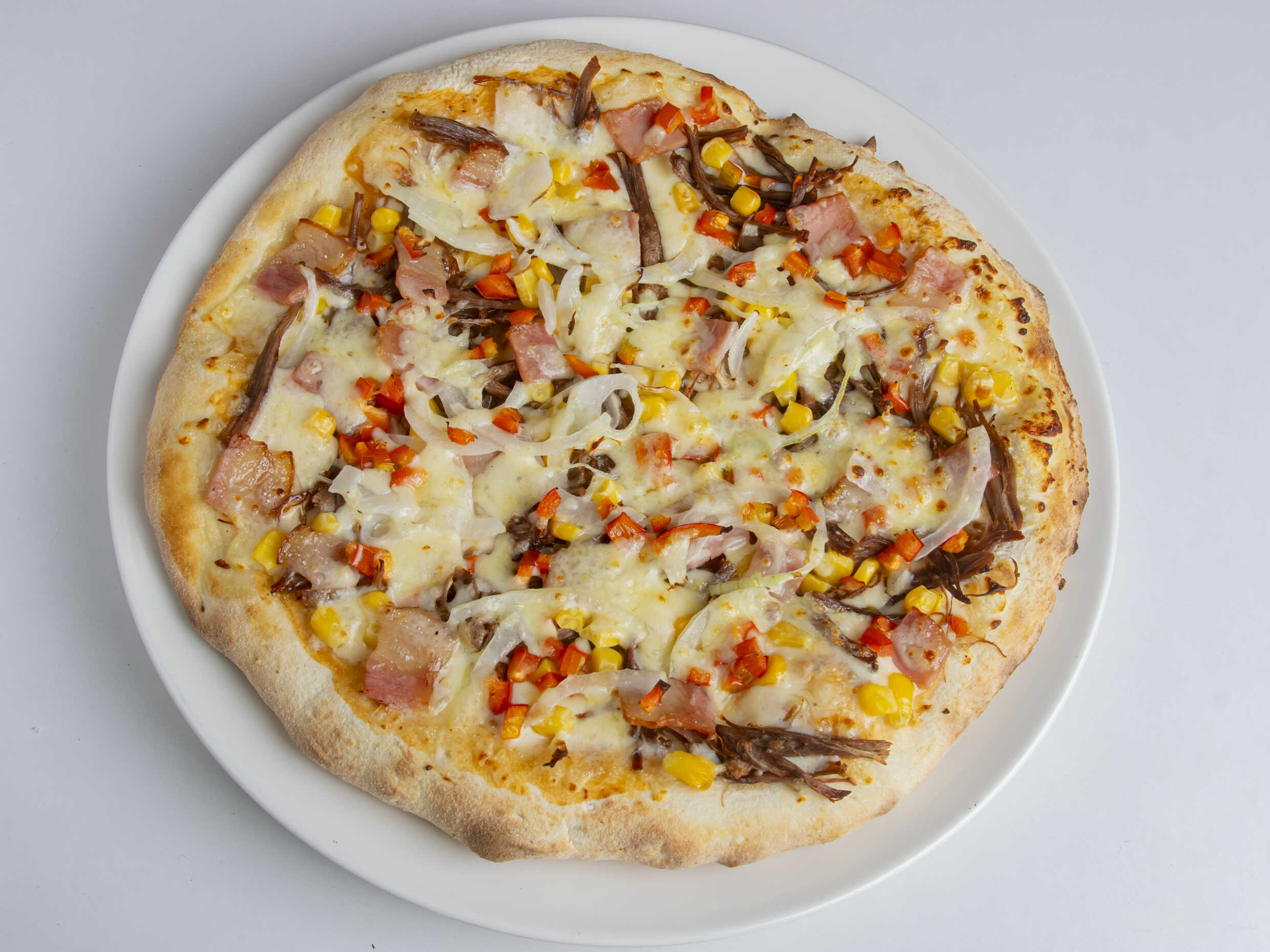 Queso, salsa napolitana, carne desmechada, hogao, maíz, cebolla y pimentón.