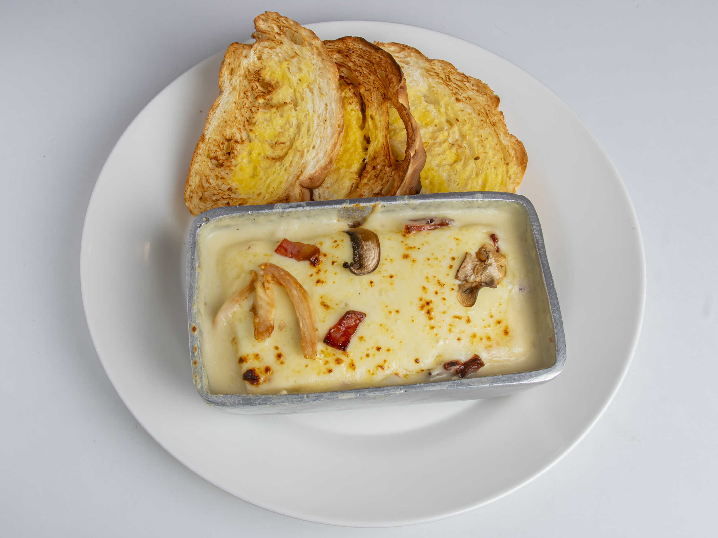 Queso, champiñones y pollo marinado en salsa BBQ.