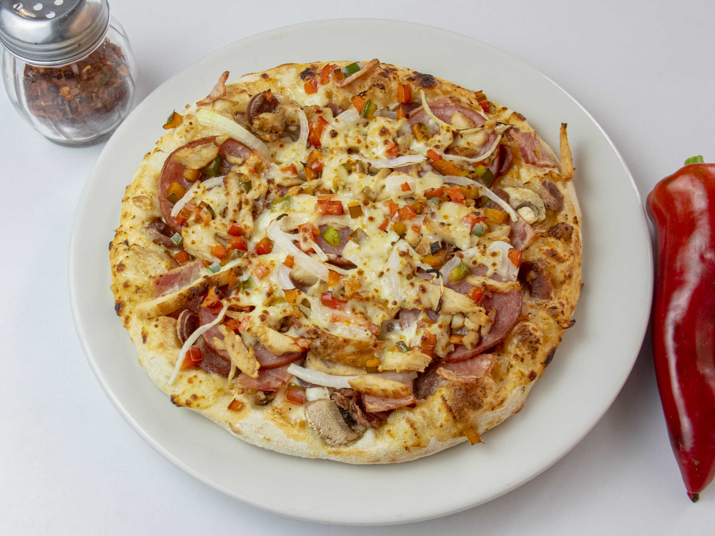 Queso, salsa napolitana, champiñones, pollo, cábano, salami, jamón, cebolla y pimentón.