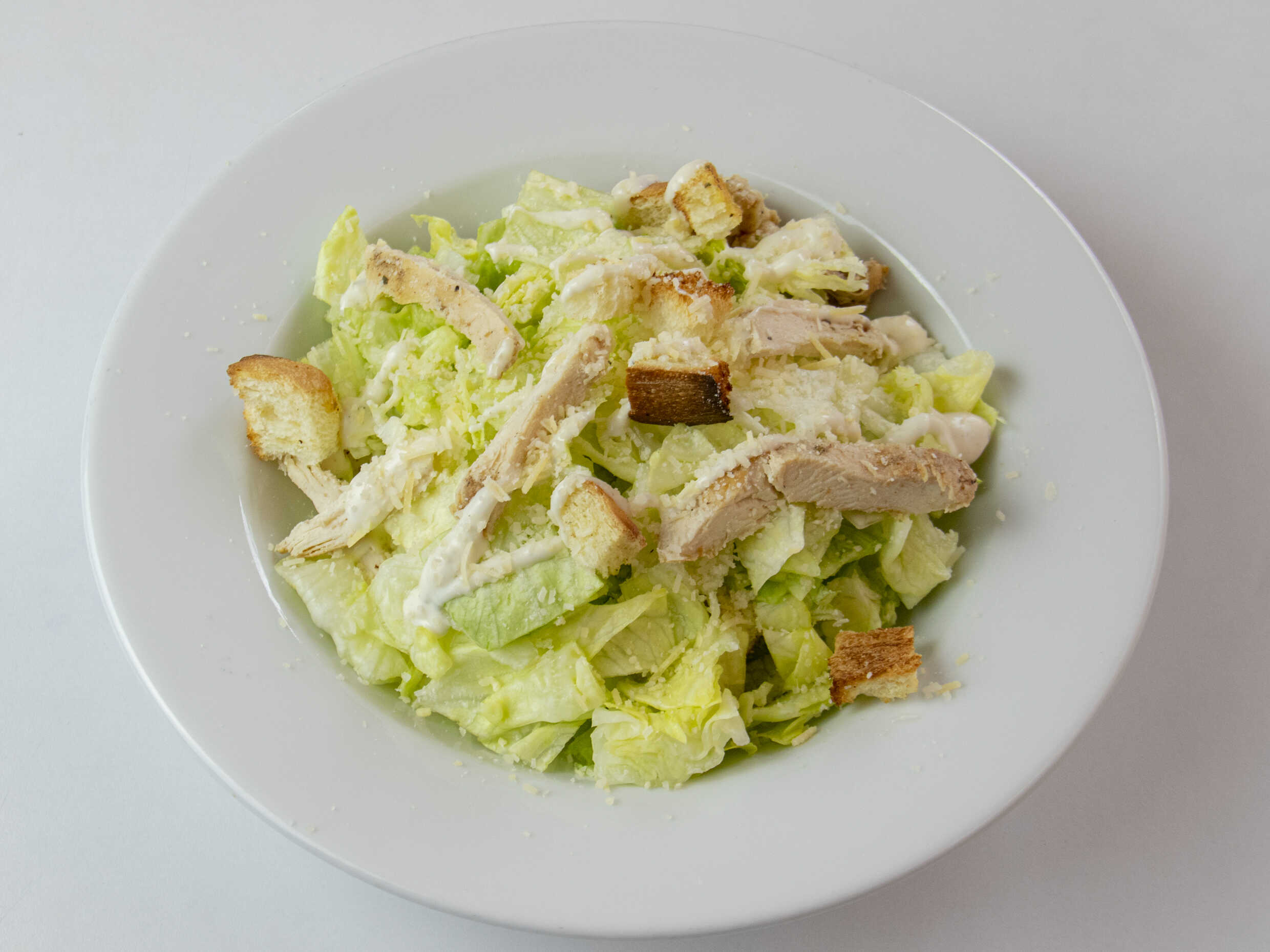 Lechuga, croutones de pan, queso parmesano, pollo desmenuzado y salsa cesar.