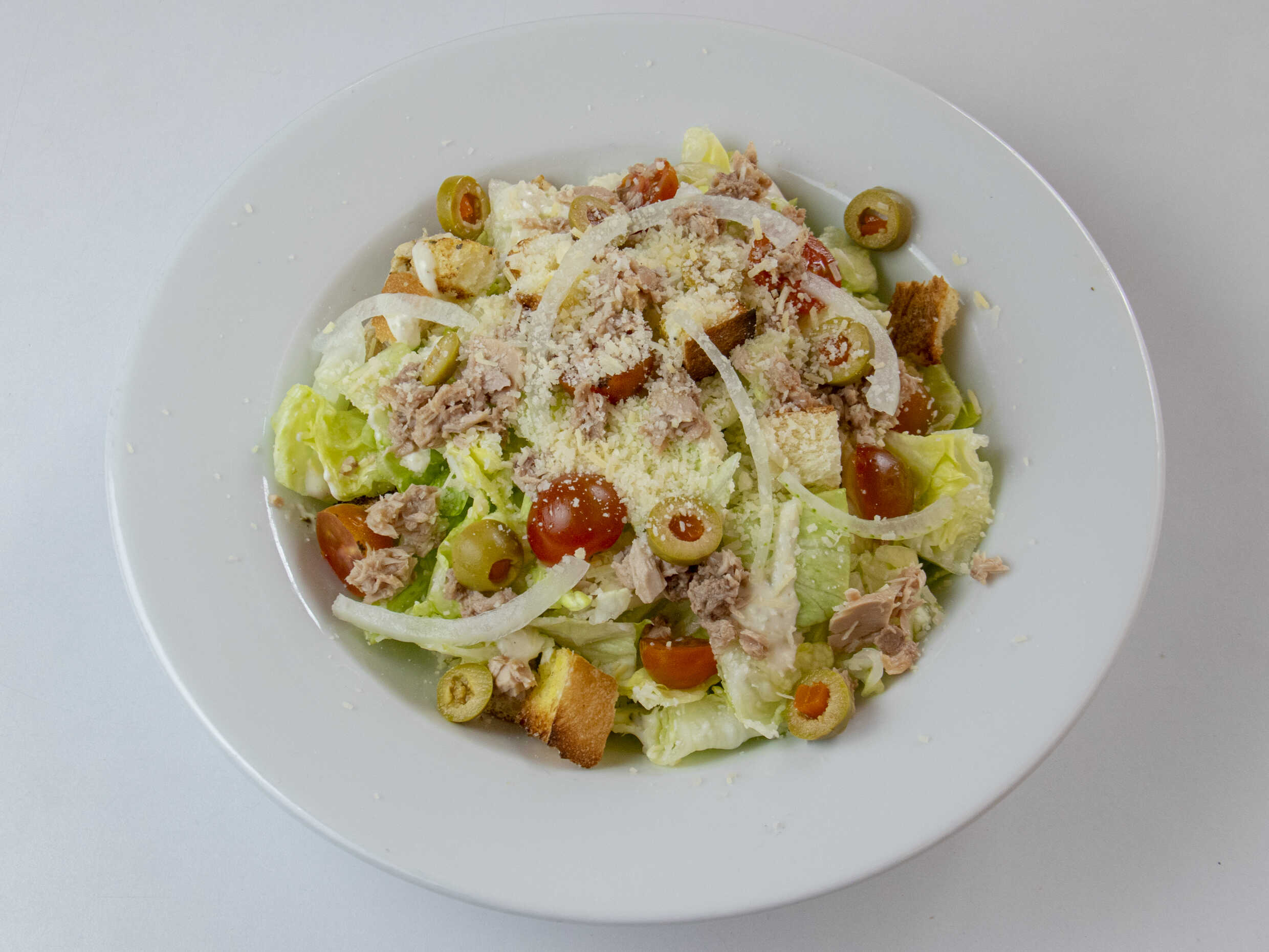 Lechuga, croutones de pan, aceitunas, champiñones, maíz, queso parmesano, atún y salsa cesar.