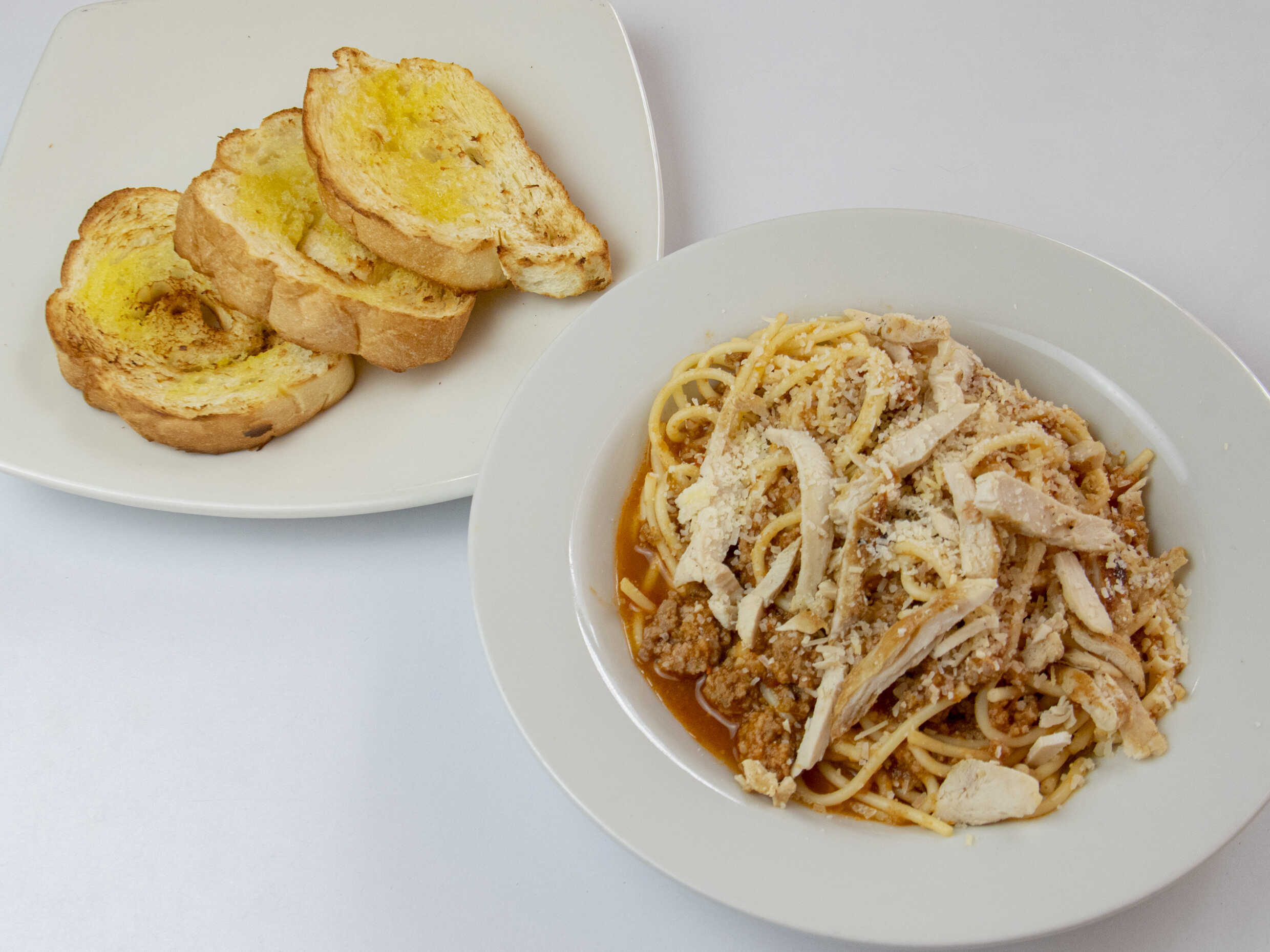 Lasagna con queso, salsa a elección, jamón y pollo.