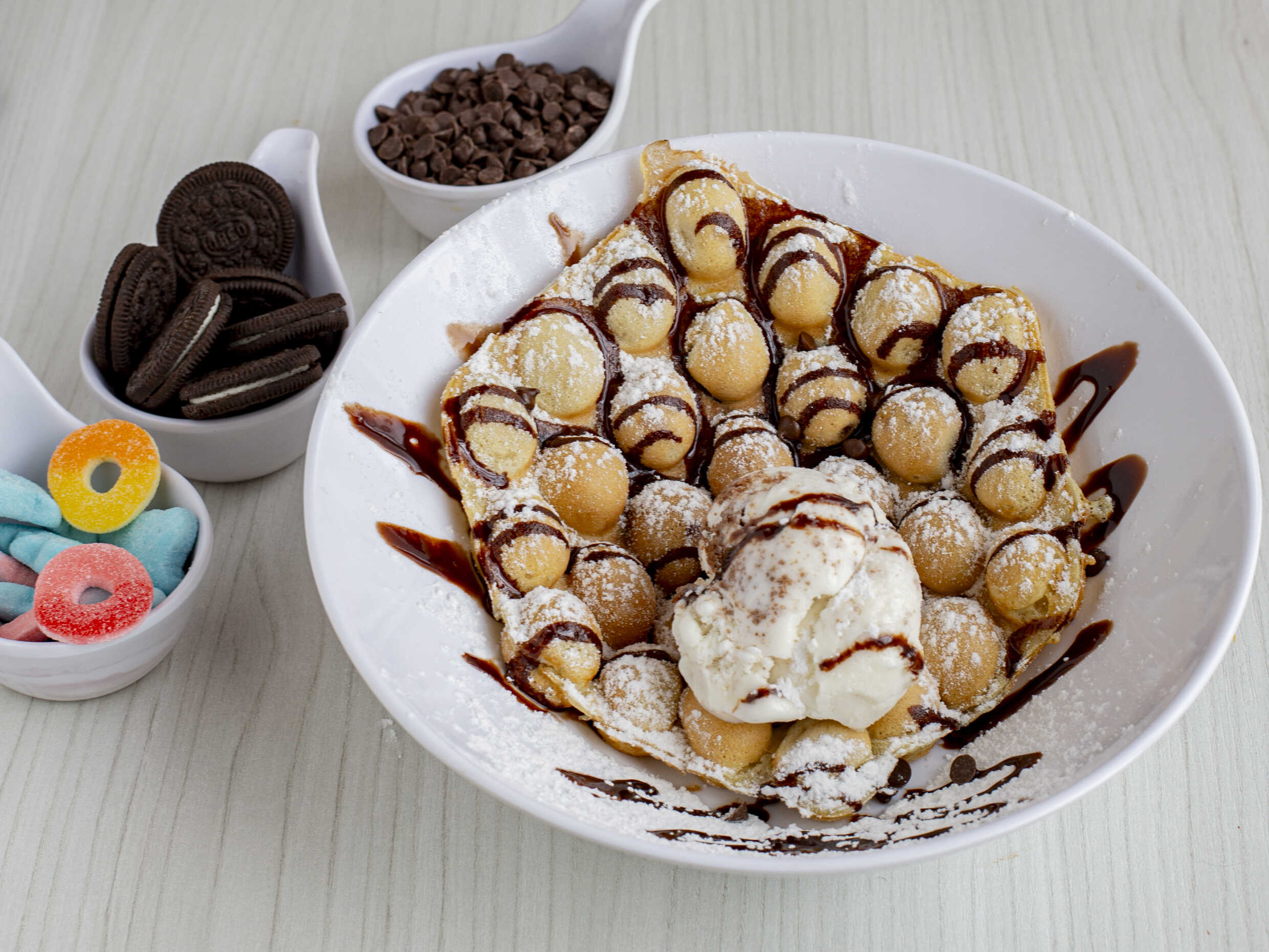 Con cereza maraschino, mango en trozos y salsa de maracuyá de la casa, todo sobre nuestro burbu waffle recién hecho.