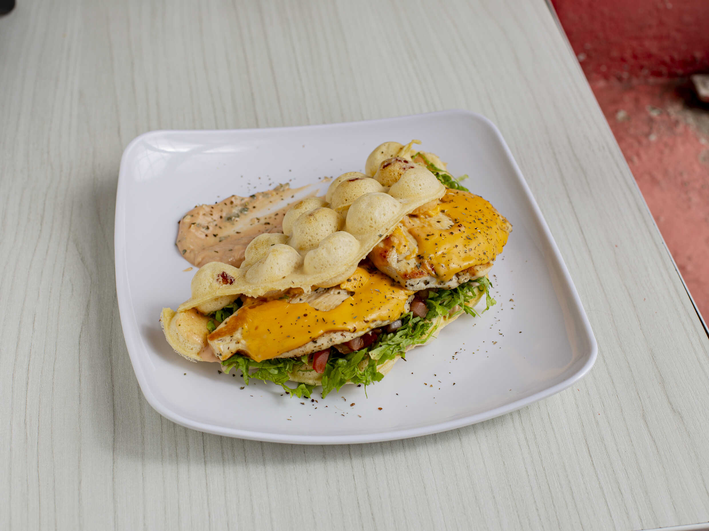 "Tornado Burbuja" Saborea un waffle irresistiblemente crujiente con burbujas de tocineta rellenas, acompañado de pechuga a la plancha, queso cheddar fundido, fresca albahaca, lechuga crujiente, tomate jugoso y nuestra exclusiva salsa de la casa. Una experiencia de sabor única