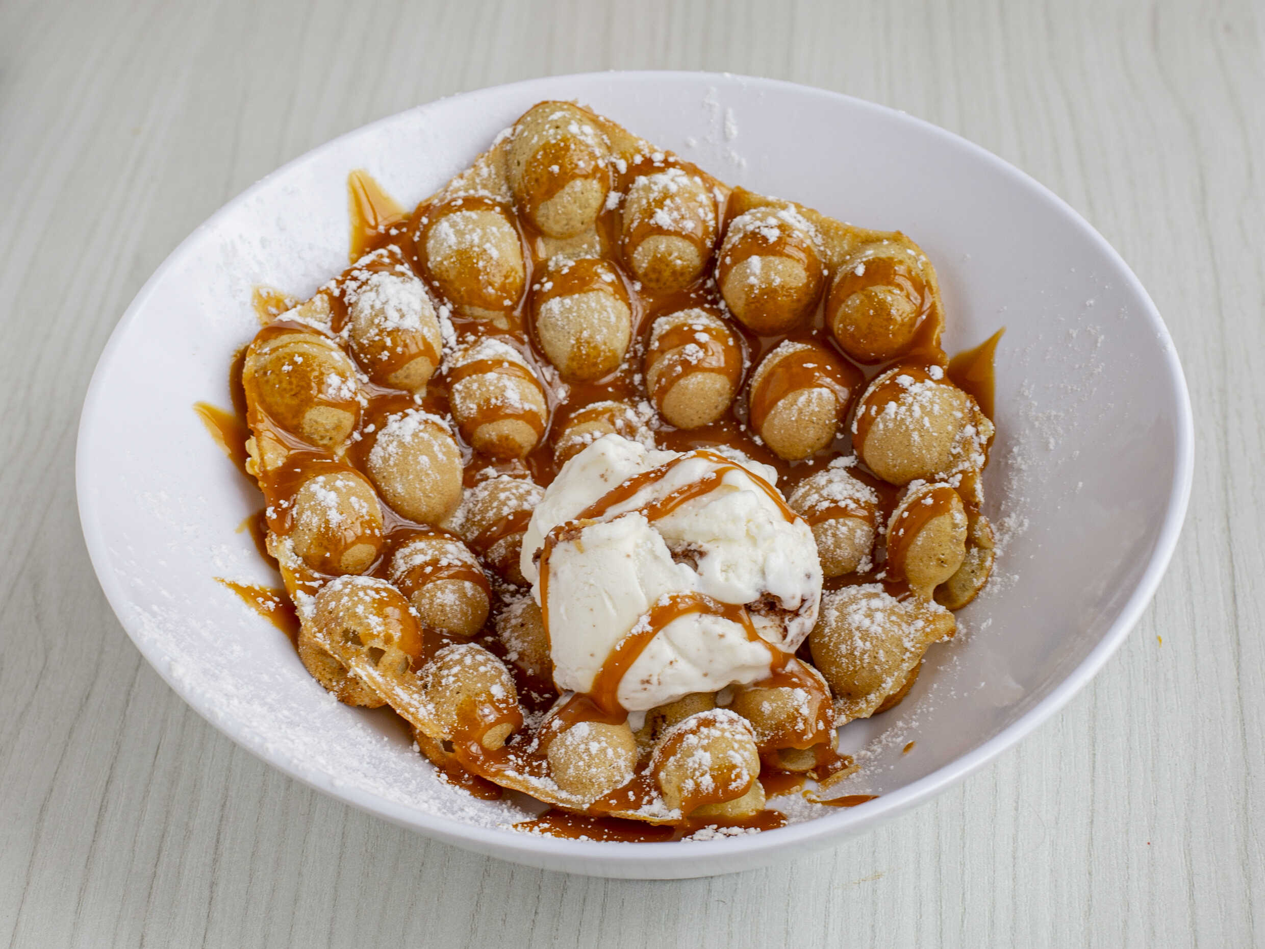 “Burbu Choco-arequipe" Waffle exquisito con sorprendentes burbujas , combinado magistralmente con arequipe y chocolate. coronado con helado para una experiencia sublime.