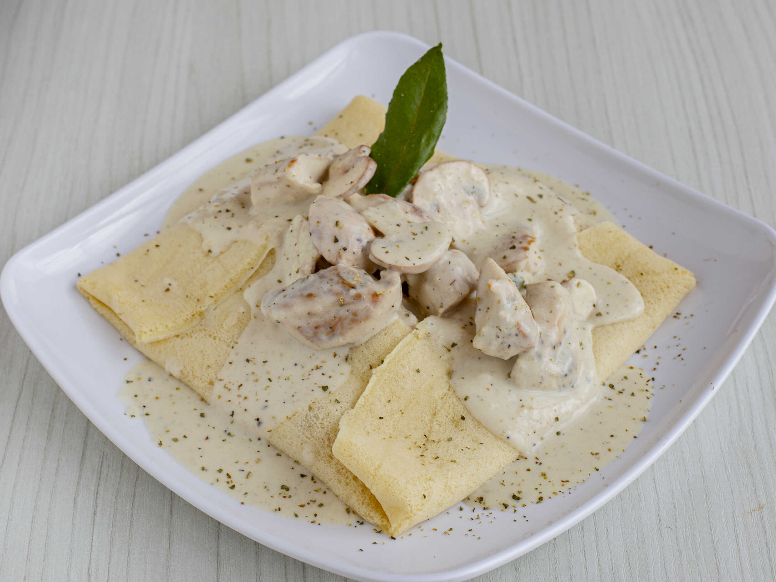 "Crepe de pollo champiñon" Deléitate con un crepé relleno de tierna carne de pollo en una deliciosa salsa bechamel con champiñones. Una combinación irresistible que une lo suave y lo sabroso