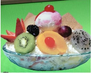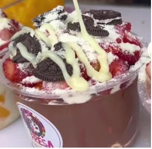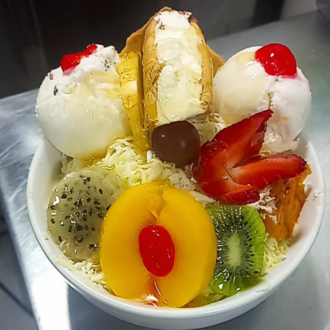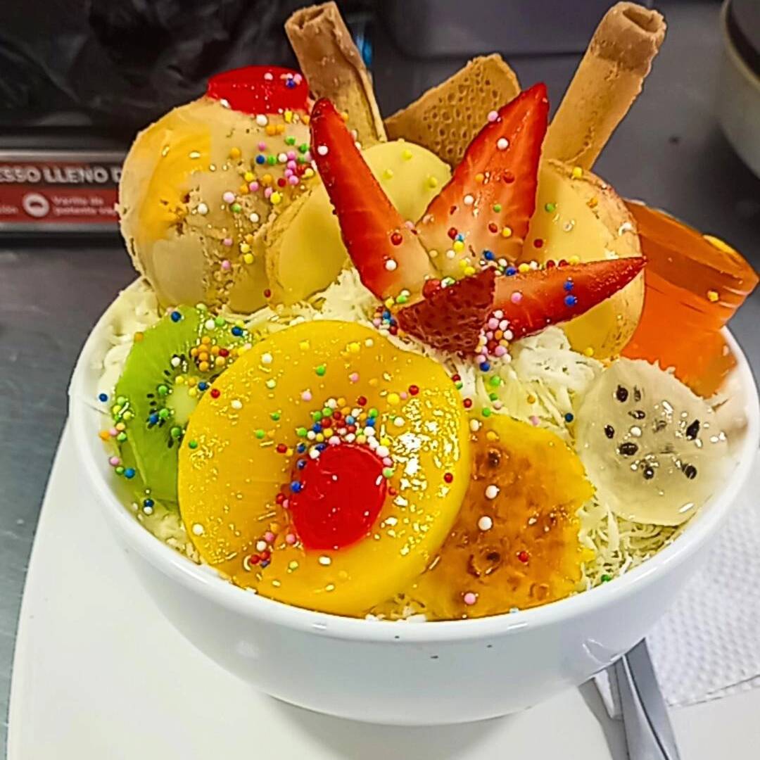 Picado de papaya, melón, pera, fresa, banano, crema, queso helado, pitaya, kiwi, higo, durazno, cereza, manzana, uvas, galletas y salsas.