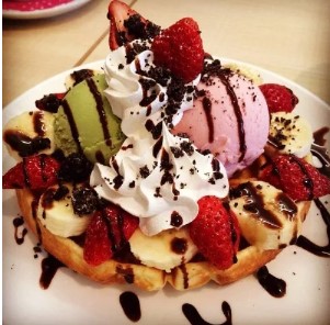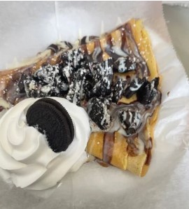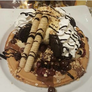 Waffle de oreo, Relleno de banano, nutella, chantilly, galleta oreo, helado, barquillos y salsa de chocolate. + Ensalada Super Especial, Picado de papaya, melón, pera, fresa, banano, crema, queso helado, pitaya, kiwi, higo, durazno, cereza, manzana, uvas, galletas y salsas.
