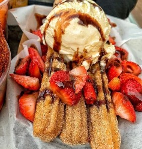 Tres churros fritos, fresas picadas, chantilly, salsas, 1 bola de helado sabor disponible.