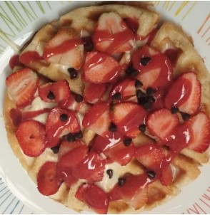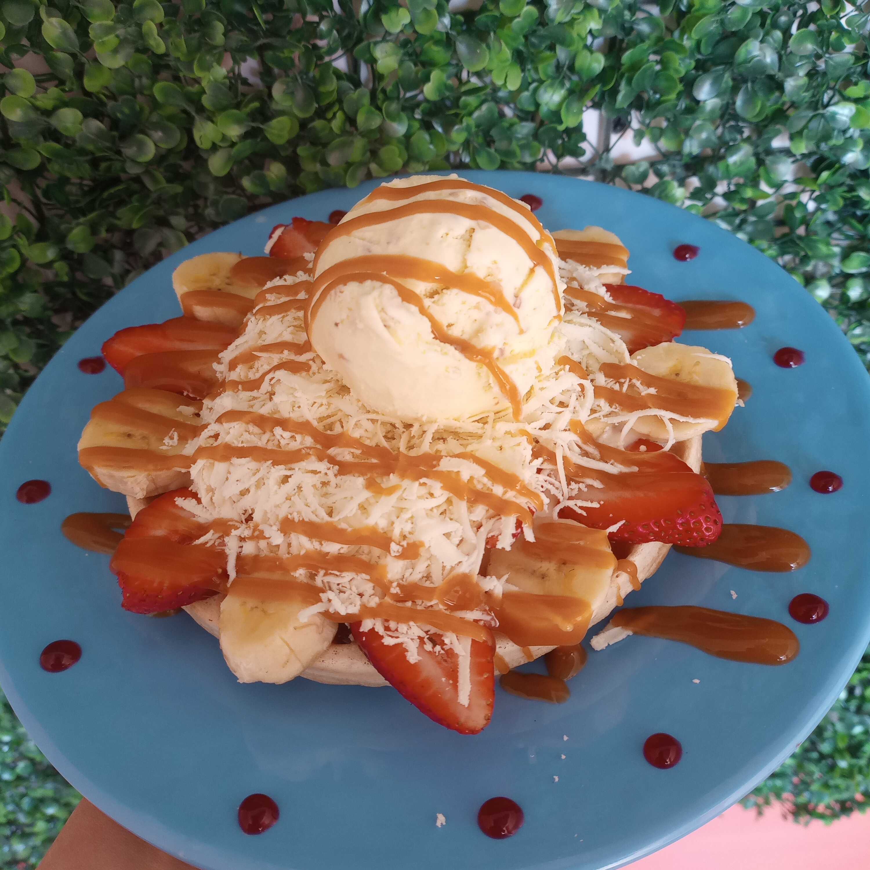 Waffle Especial, Relleno de fresa, banano, nutella, crema chantilly, dos bolas de helado a disposición, salsa de chocolate y chips de chocolate.+ Malteadas*2
