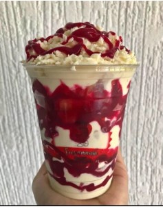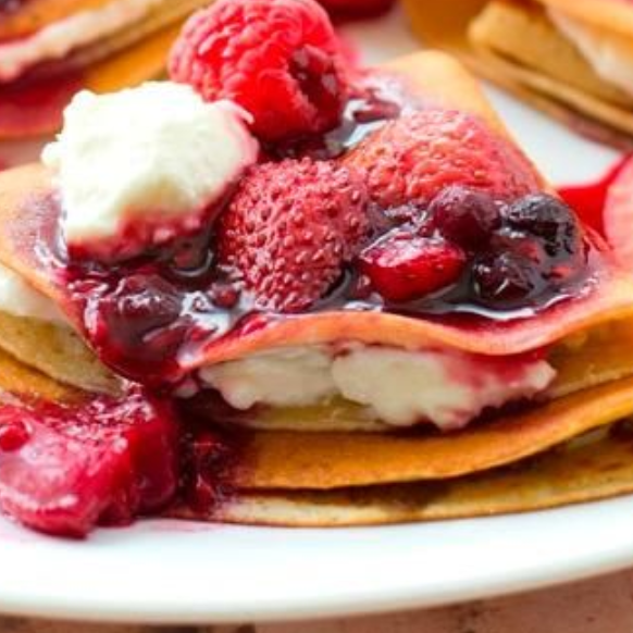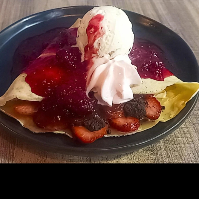 Crepa rellena de fresas picadas,dulce de mora, yogurth natural,cerezas, Chantilly,un helado,salsa de mora,mani triturado