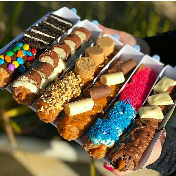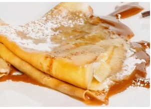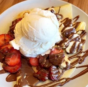 Crepes de Banano, Relleno de trozos de banano, fresa, nutella, chantilly, 1 helado sabor disponible y salsa de chocolate. + Crepes de Durazno, Relleno de queso crema, durazno, chantilly, helado y leche condensada.