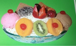 Dos bananos picados, dos helados, medio platillo crema, queso, kiwi, pitaya, higo, durazno, fresa, cereza, salsas y galleta .