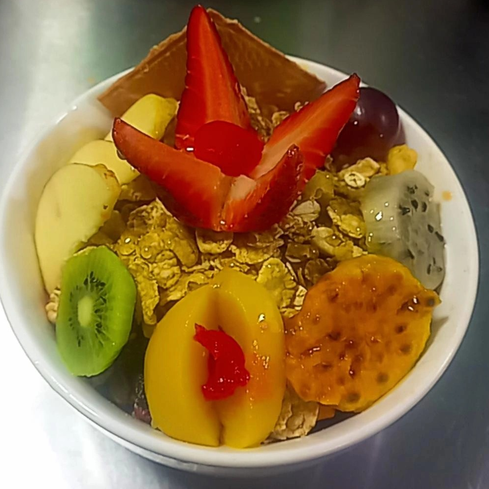 Papaya, melón, pera, banano, fresa, manzana, kiwi, pitaya, durazno, uvas, higo, cereza, galleta,granola..