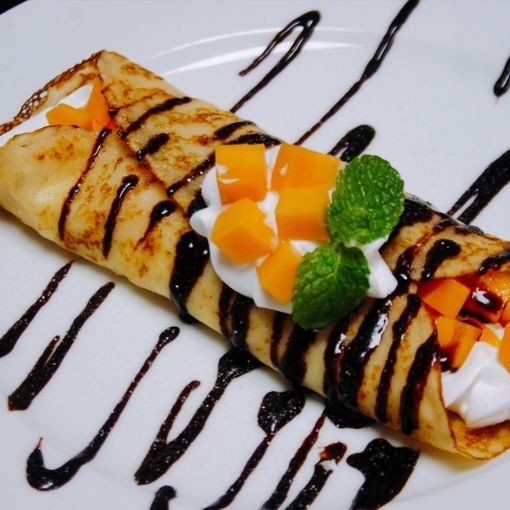 1 Crepa rellena de mango, banano, durazno, crema, chantilly, helado y salsa.