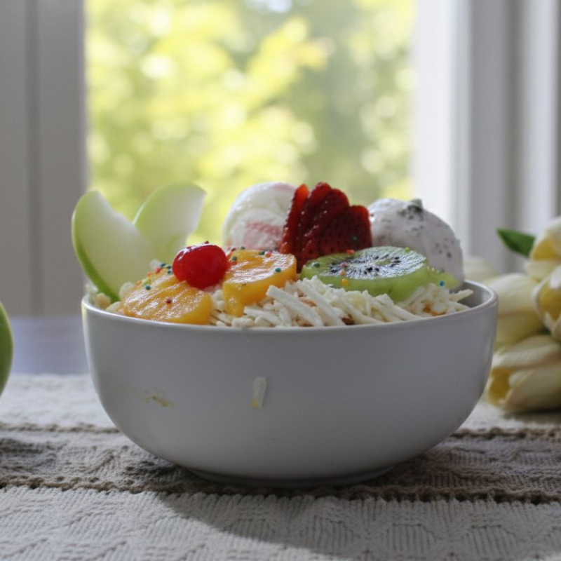 Ensalada de frutas de 32oz, contiene mix de frutas servidas con nuestra crema de leche artesana, queso rallado, miel, durazno, manzana, kiwi, fresa, cereza, grajeas y dos porciones de helado.