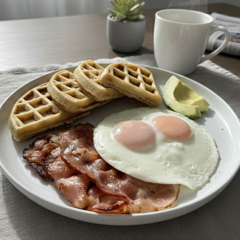Waffle salado con tocino, huevo frito, aguacate y miel