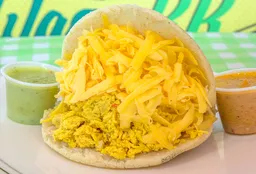 arepa asada, huevos revueltos, queso y frijol negro