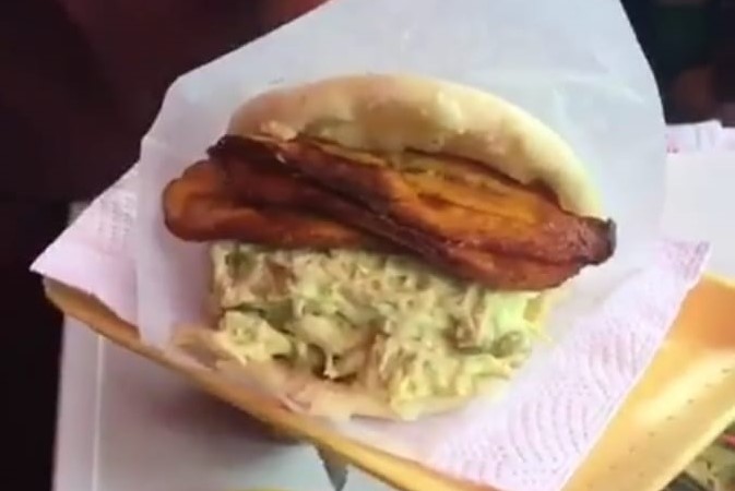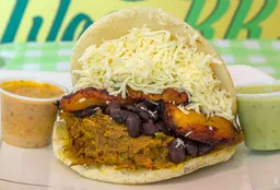 Arepa rellena de Frijol Negro, Carne Mechada, Queso y Plátano.