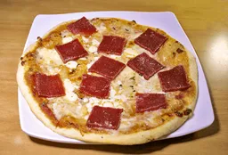 Masa delgada, queso, tocineta y salsa ciruela. 20 cm de diámetro.