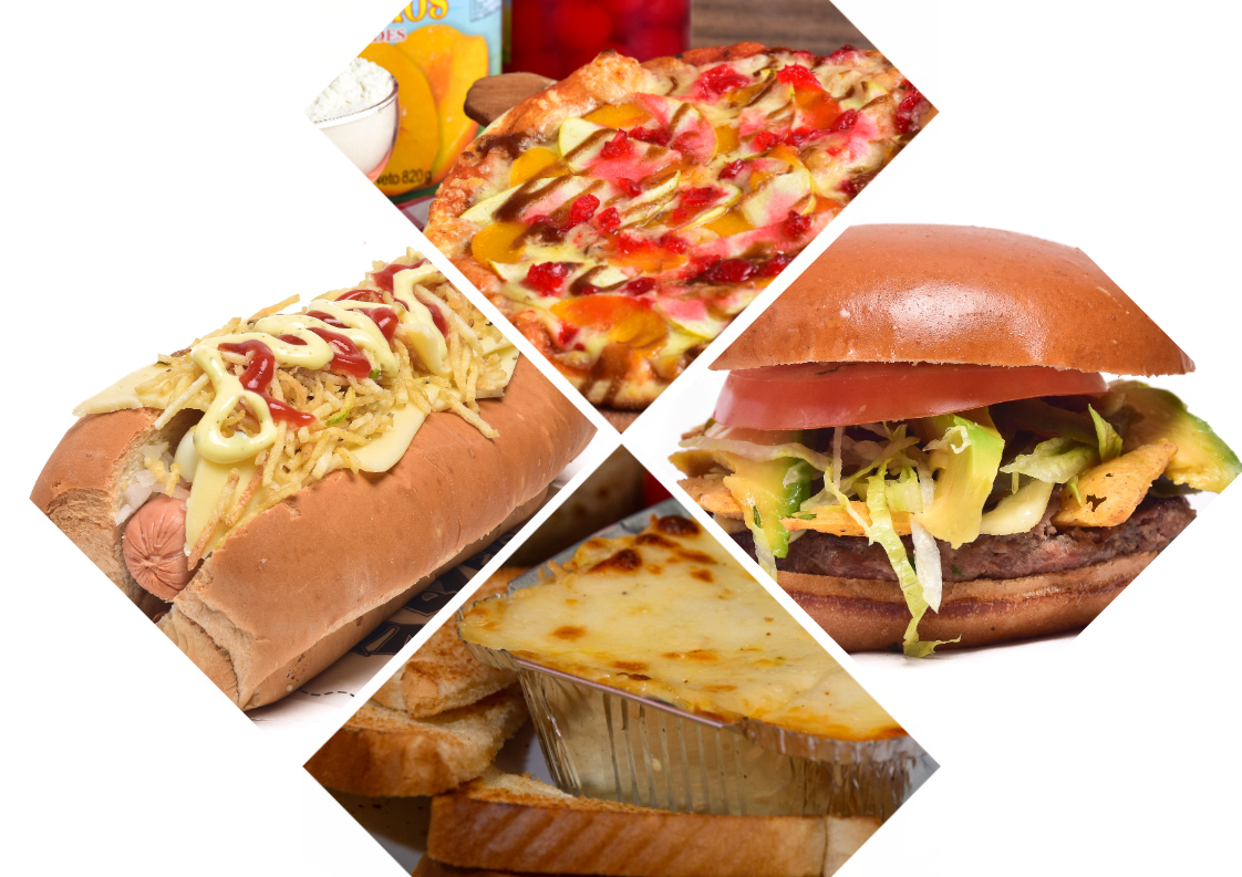 135 grs de carne, queso, lechuga, tomate, cebolla caramelizada, pollo desmechado, champiñón, tocineta, jamón de cerdo, pan brioche y salsas.