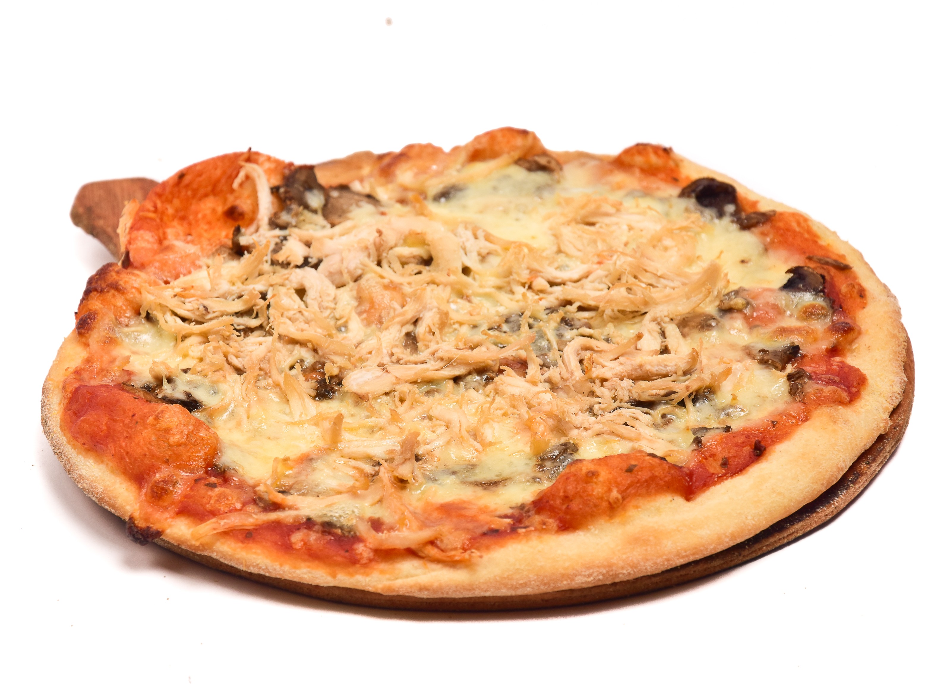 Masa delgada, queso, pollo desmechado y champiñones. 22 cm de diámetro.