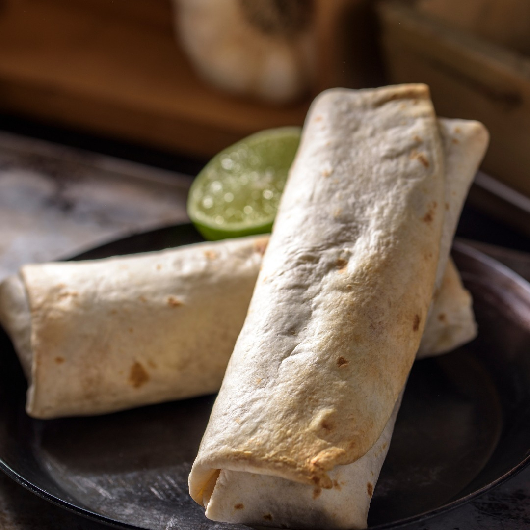 Tortilla de harina de trigo, trozos de carne, cebolla, lechuga y queso, acompañado de nachos, guacamole y jalapeños