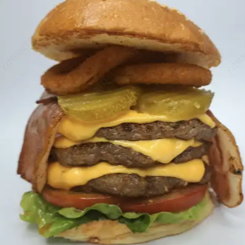Hamburguesa con tres carnes de res de 150 gr, queso cheddar, pepinillos, aros de cebolla, lechuga y tomate.