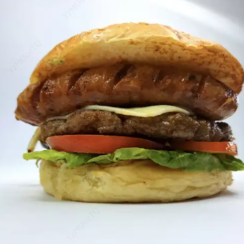 Hamburguesa con carne de res, chorizo, lechuga, tomate.
