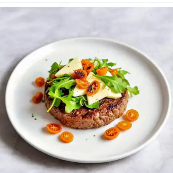 Hamburguesa con carne de res de 150 gr, queso de búfala, rúgula y tomates secos.