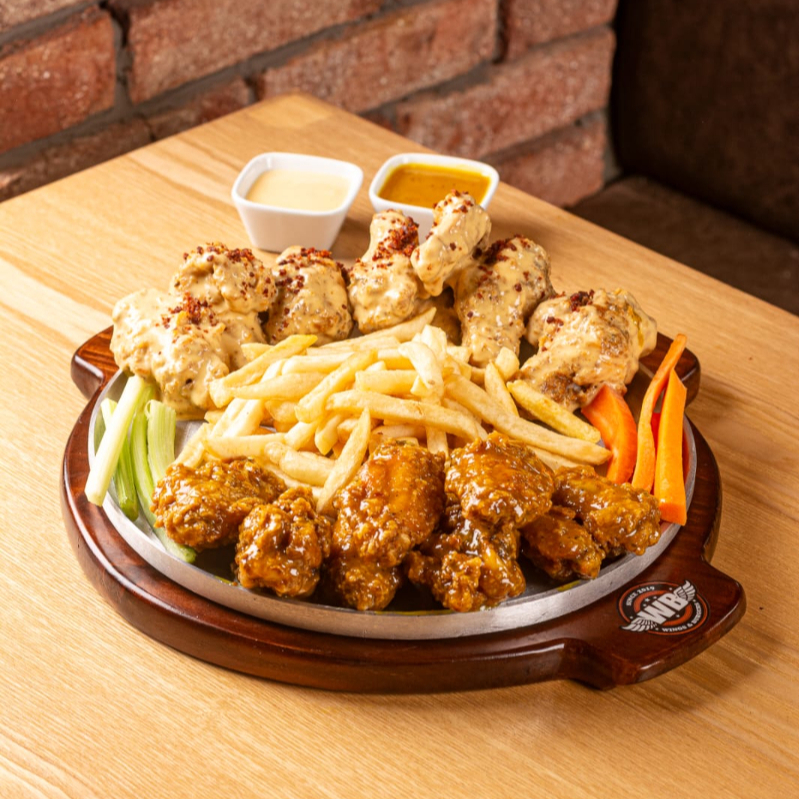10 Alitas con 2 salsas a elegir, acompañadas de apio, zanahoria y papa a la francesa.