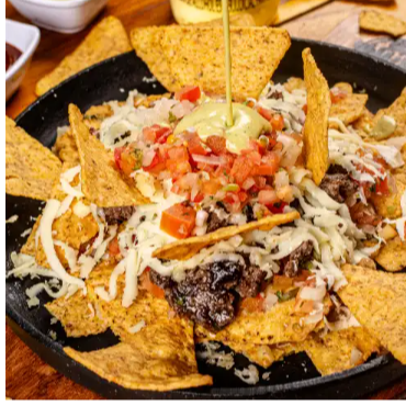 Tortilla de maíz cubierta con carne de hamburguesa, pico de gallo, guacamole y queso costeño.