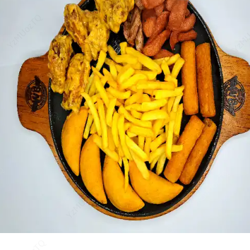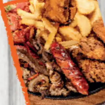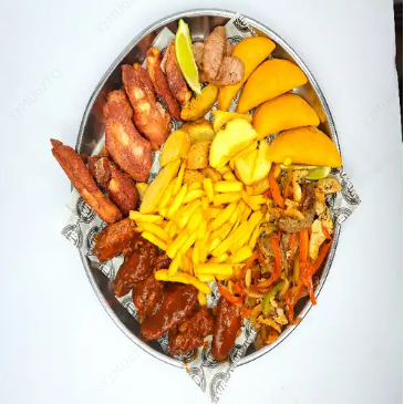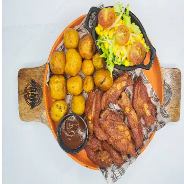6 Alitas, salchicha, chorizo, 5 empanadas (con relleno del día), acompañados de 5 yucas y papa a la francesa.