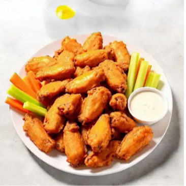 30 Alitas con 3 salsas a elegir, acompañadas de apio, zanahoria y papa a la francesa.