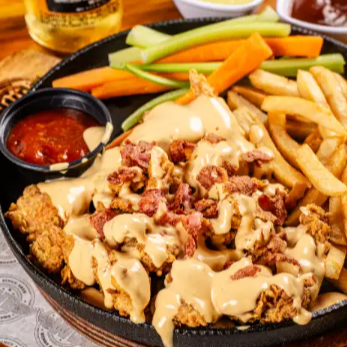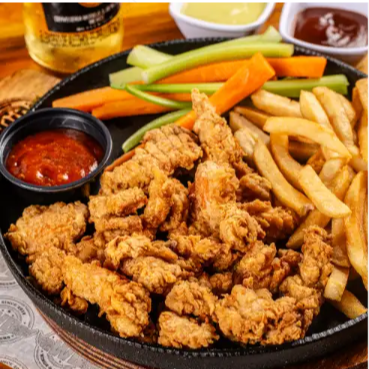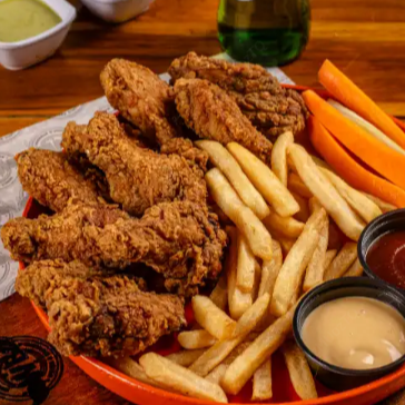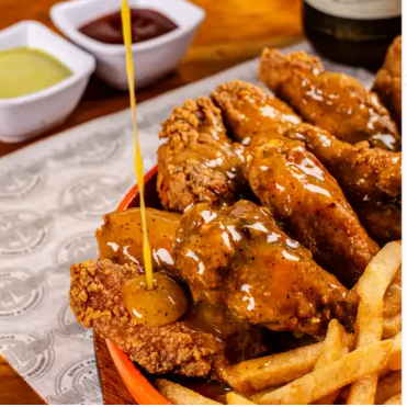 Tiras de pechuga apanadas 500 gr bañadas en 2 salsas a elegir con papas francesas, apio y zanahoria.