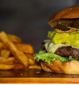 Hamburguesa con carne de res, queso, pico de gallo, guacamole, lechuga, tomate.