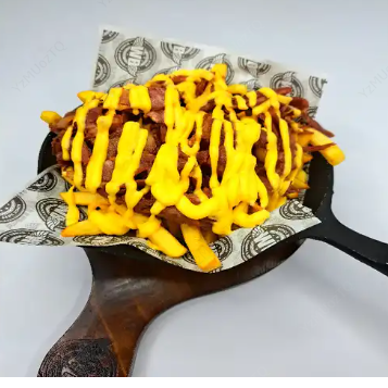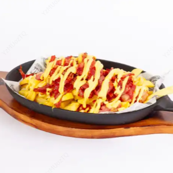 Papa francesa con queso cheddar y tocineta crocante.