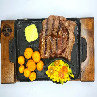 Corte de chata tipo mariposa 300 gr, maduración intermedia con mucho sabor, acompañados de papa criolla, guacamoles y ensalada de la casa.