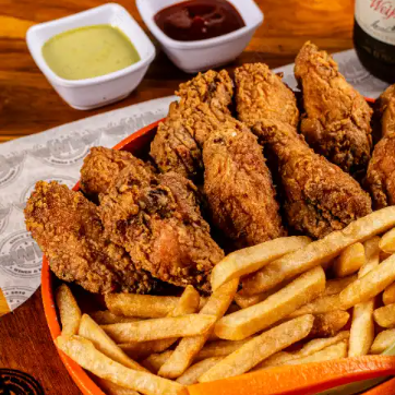 Tiras de pechuga apanadas 100 gr bañadas en 3 salsas, con papa francesa, apio y zanahoria.